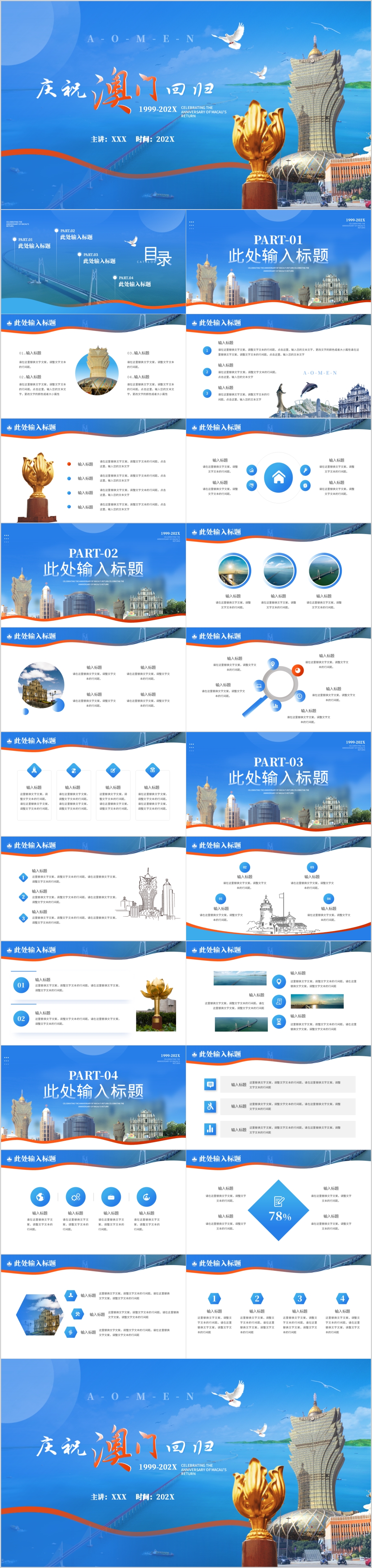 蓝色澳门回归周年纪念日爱国主义教育通用ppt模板