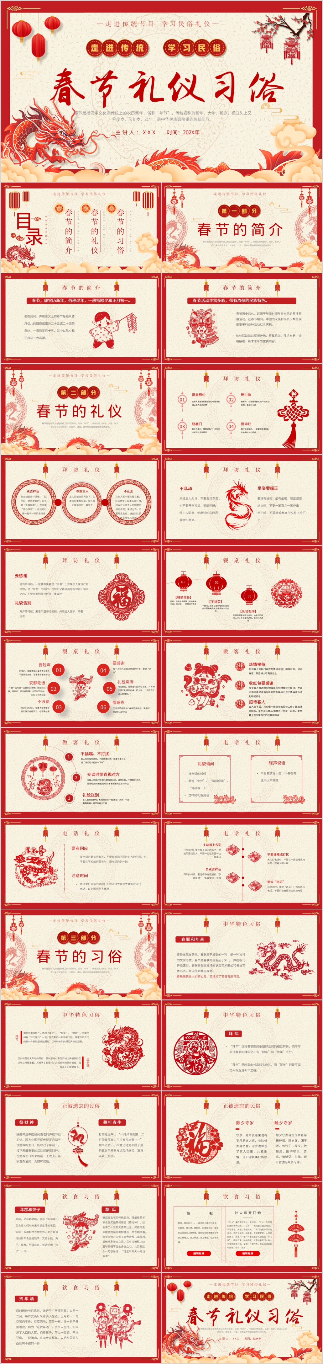 中国风2024剪纸新年春节礼仪习俗节日介绍ppt模板