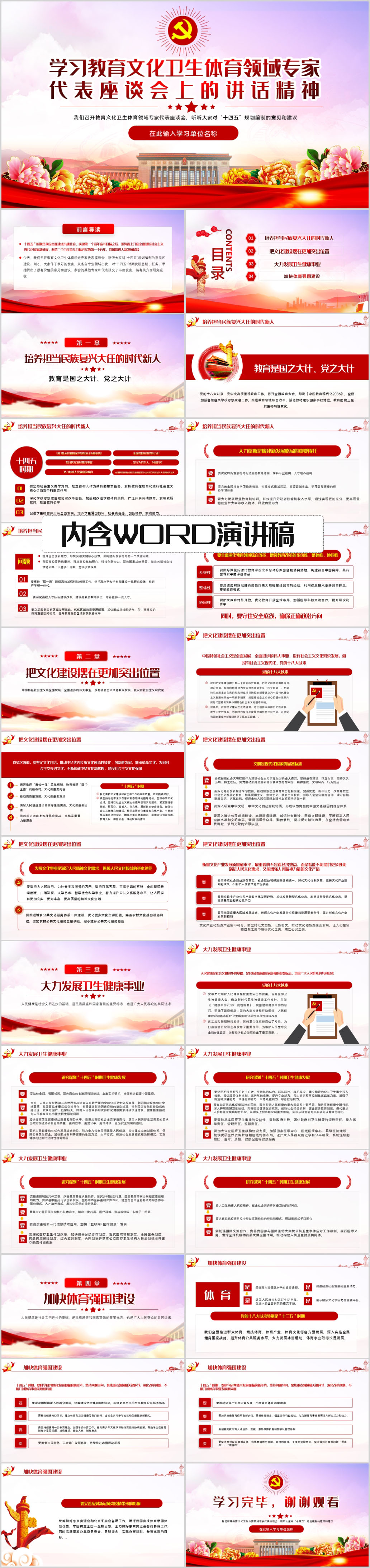 学习在教育文化卫生体育座谈会重要讲话精神党课PPT(内含WORD)
