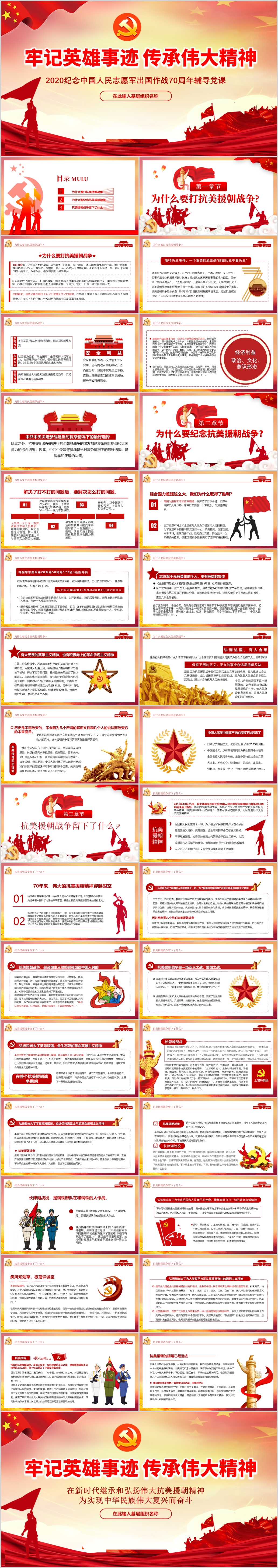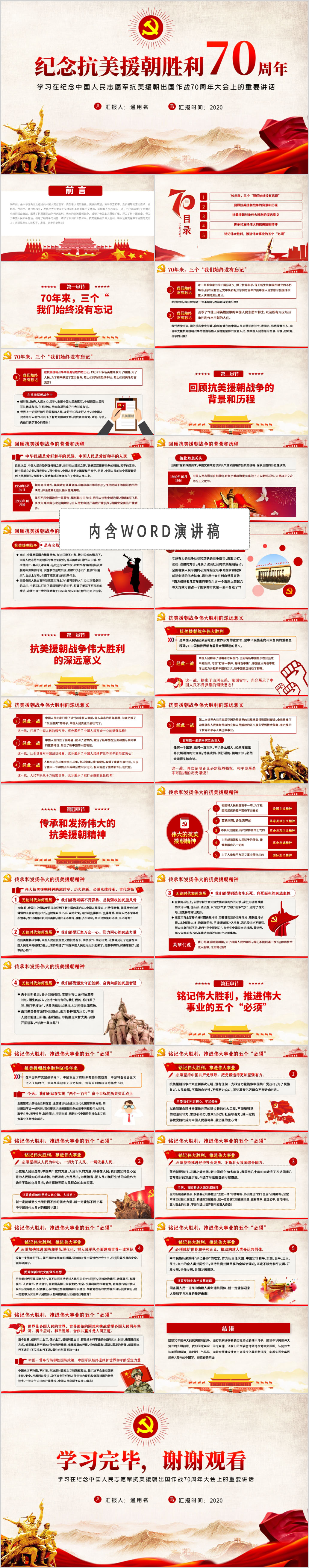 学习在纪念中国人民志愿军抗美援朝出国作战70周年党课PPT模板(含WORD演讲稿