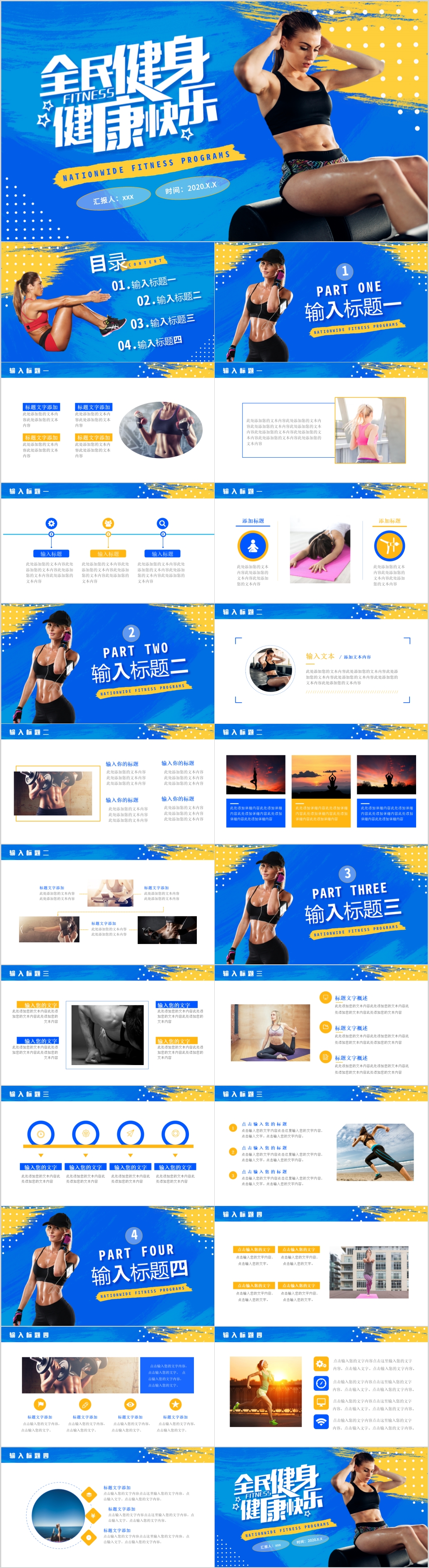蓝色全民健身日主题宣传健身减肥体育运动计划ppt模板