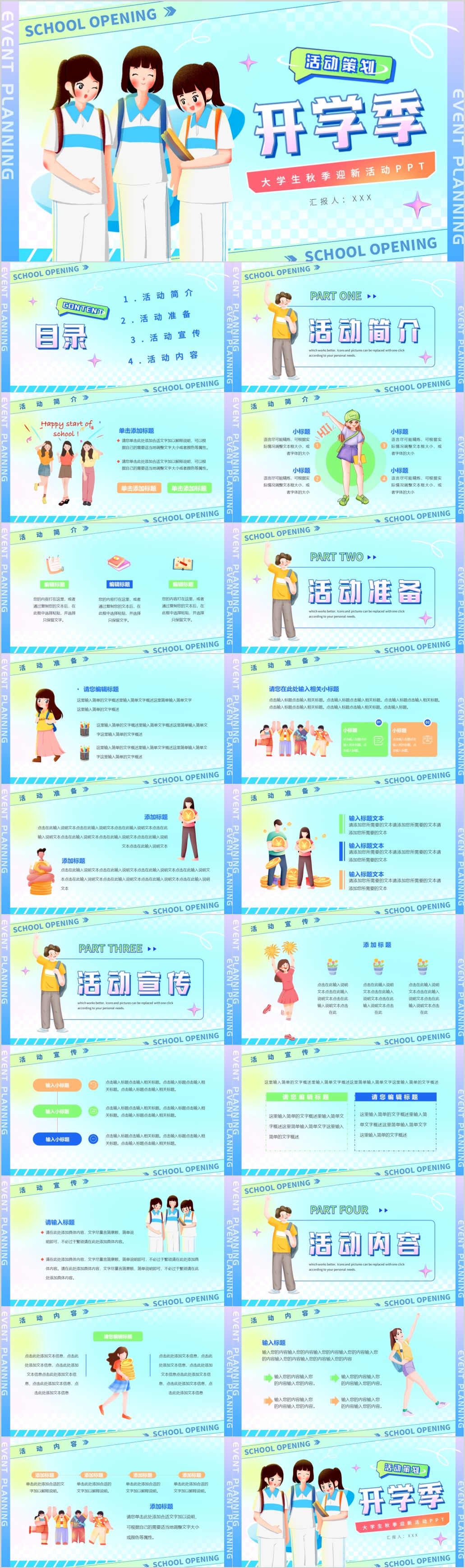 卡通大学生开学季迎新同学活动策划通用PPT模板