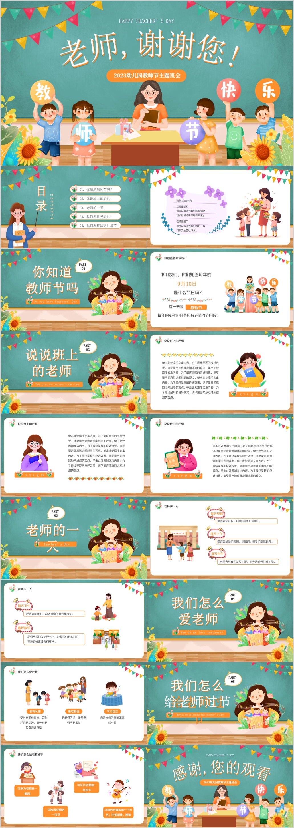 2023卡通幼儿园教师节感恩老师主题班会ppt模板