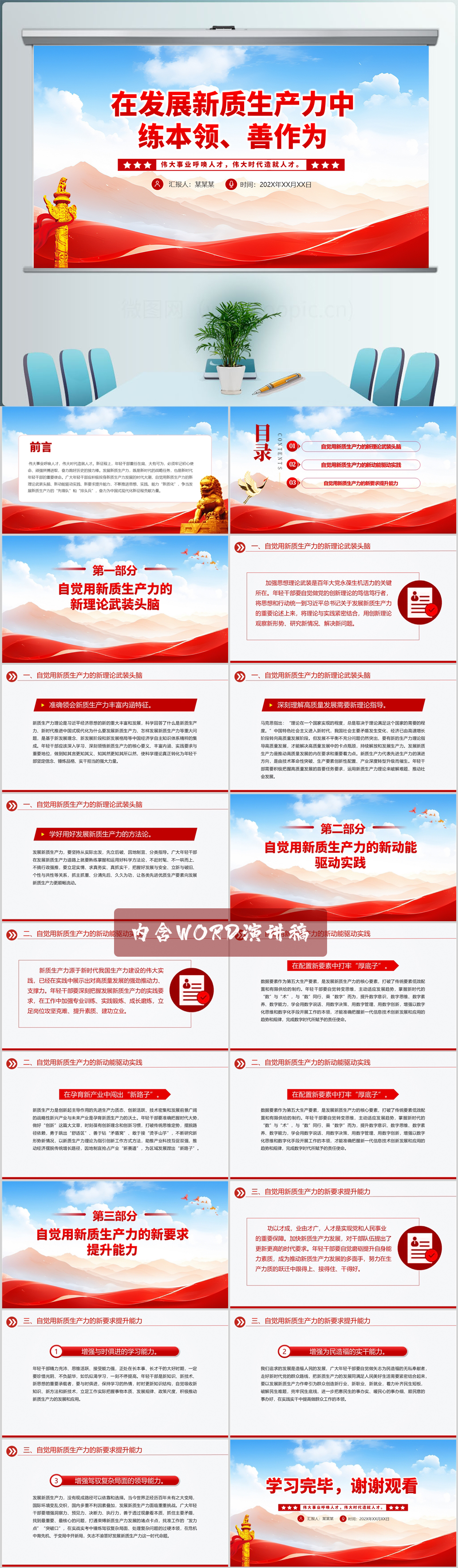 新时代年轻干部在发展新质生产力中练本领善作为党课ppt模板(内含WORD演讲稿