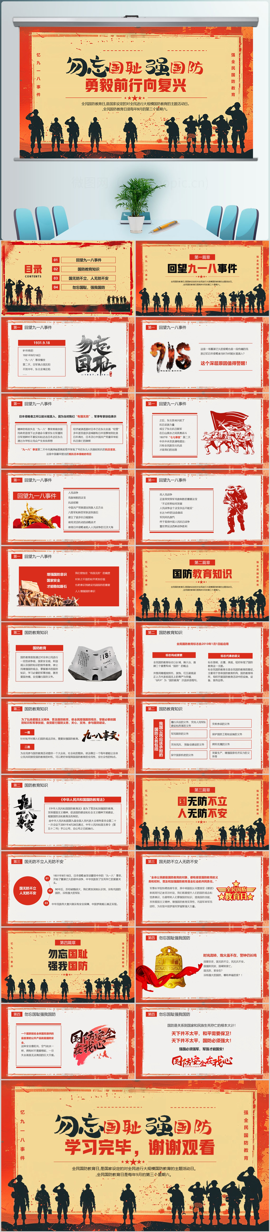 红色剪影风九一八国防教育党课PPT模板