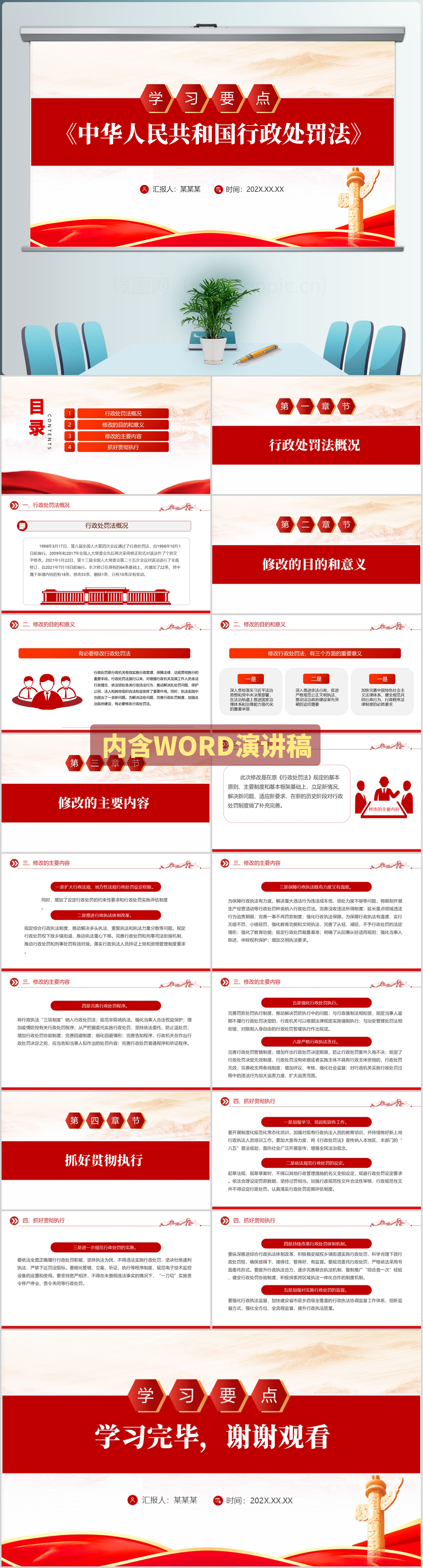 红色《中华人民共和国行政处罚法》学习要点解读党课PPT模板(内含WORD演讲稿