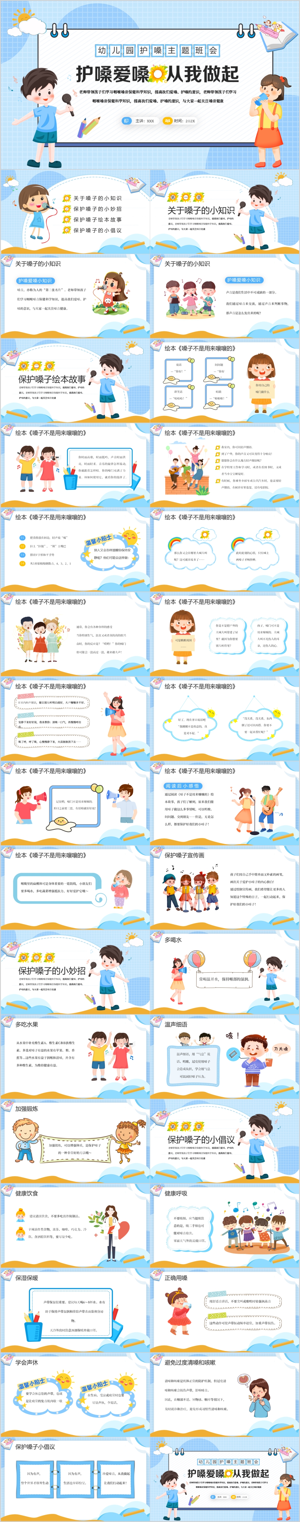 卡通幼儿园保护嗓子小知识主题班会课件PPT模板