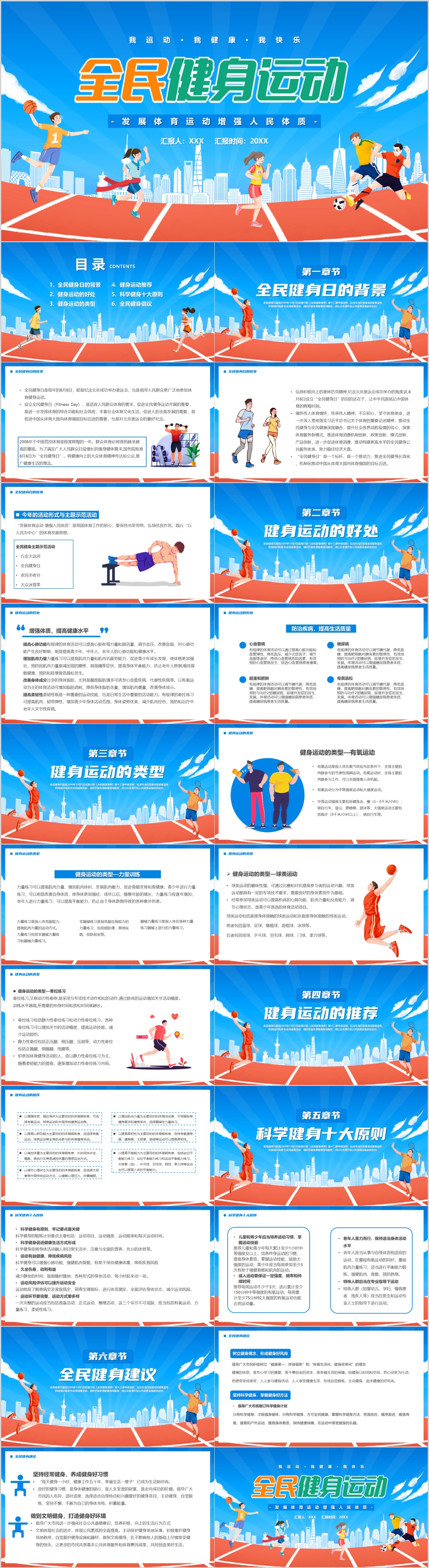 蓝色插画风简约小清新全民健身日活动策划ppt模板