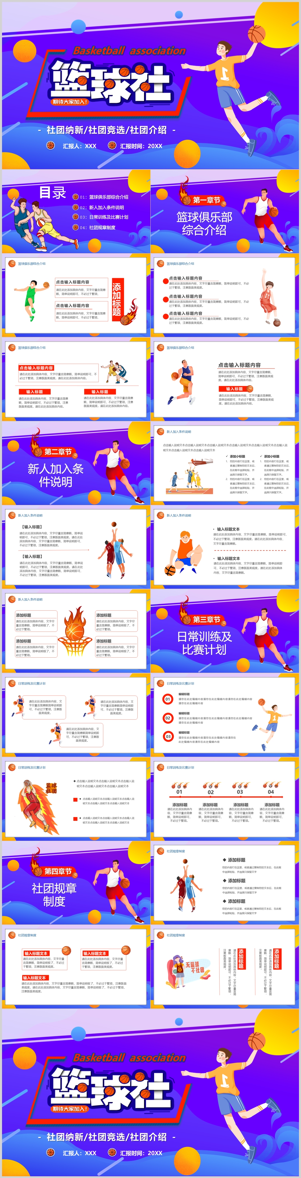蓝色大学篮球社社区纳新竞选招纳新生介绍ppt模板