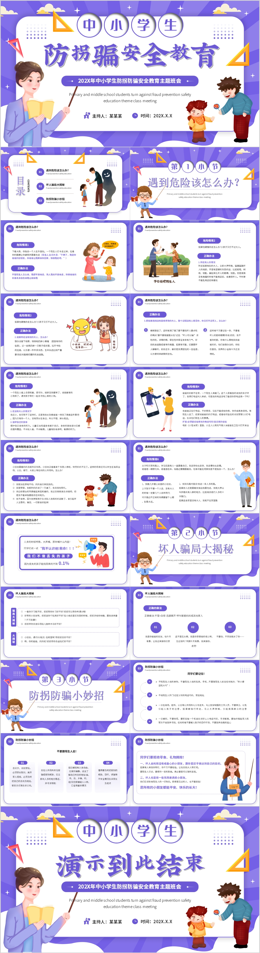 卡通风小学生防拐防骗安全教育主题班会PPT模板