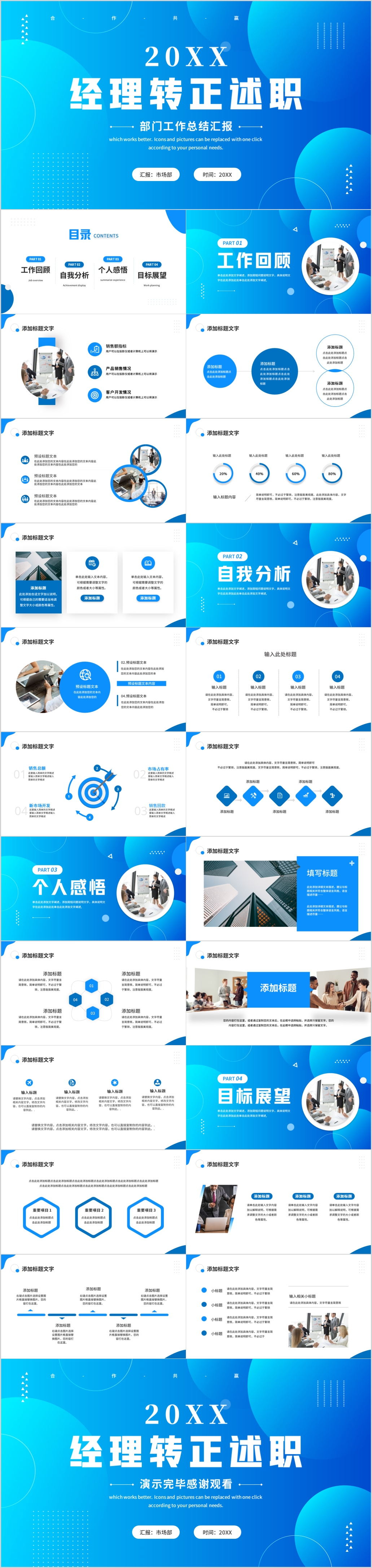2023蓝色简约商务风经理转正述职报告PPT模板