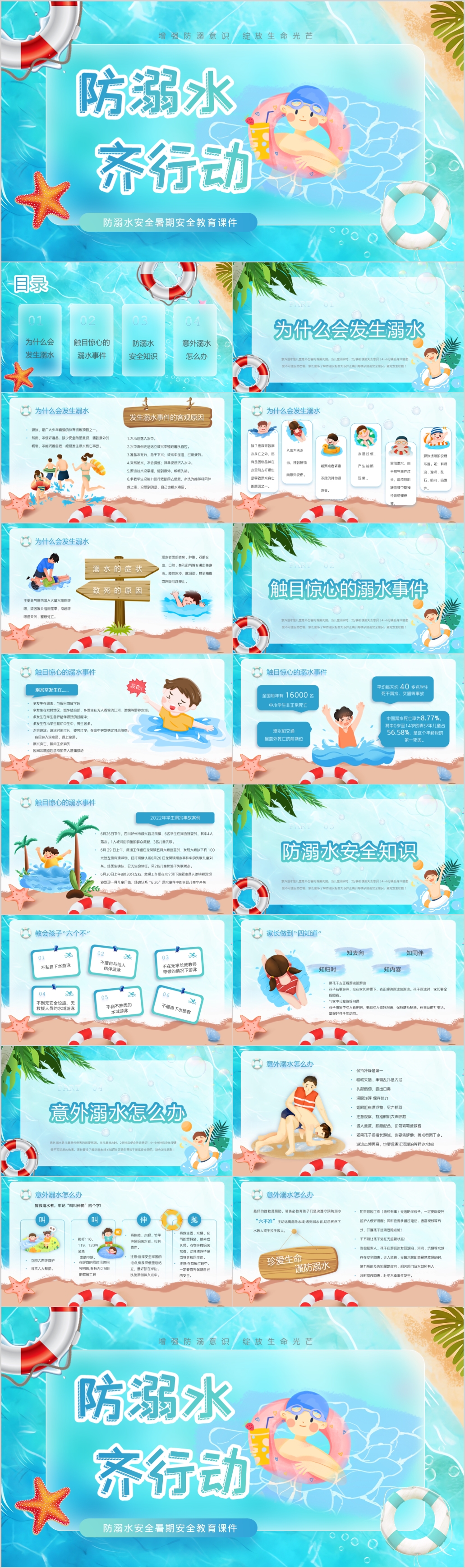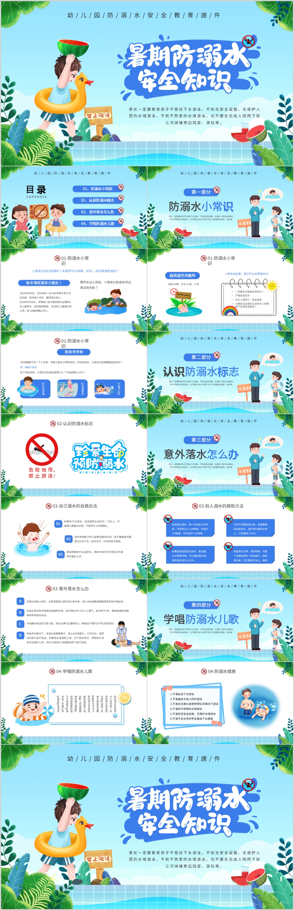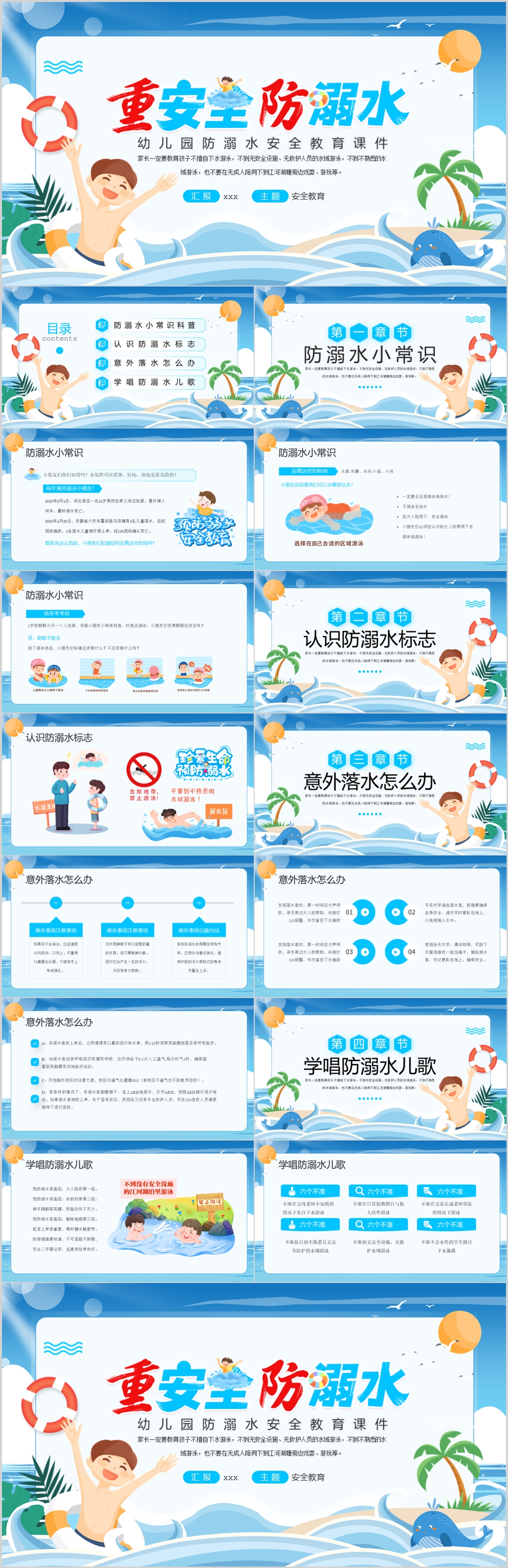 蓝色清新卡通手绘可爱防溺水暑假安全教育内容PPT模板
