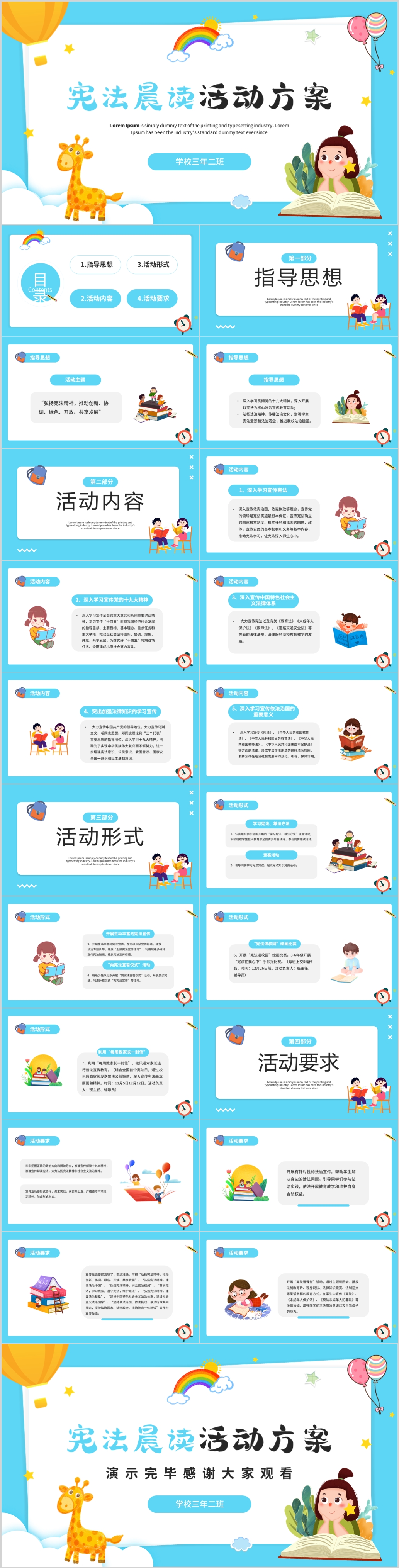 蓝色简约卡通宪法晨读普法宣传活动策划主题班会ppt模板