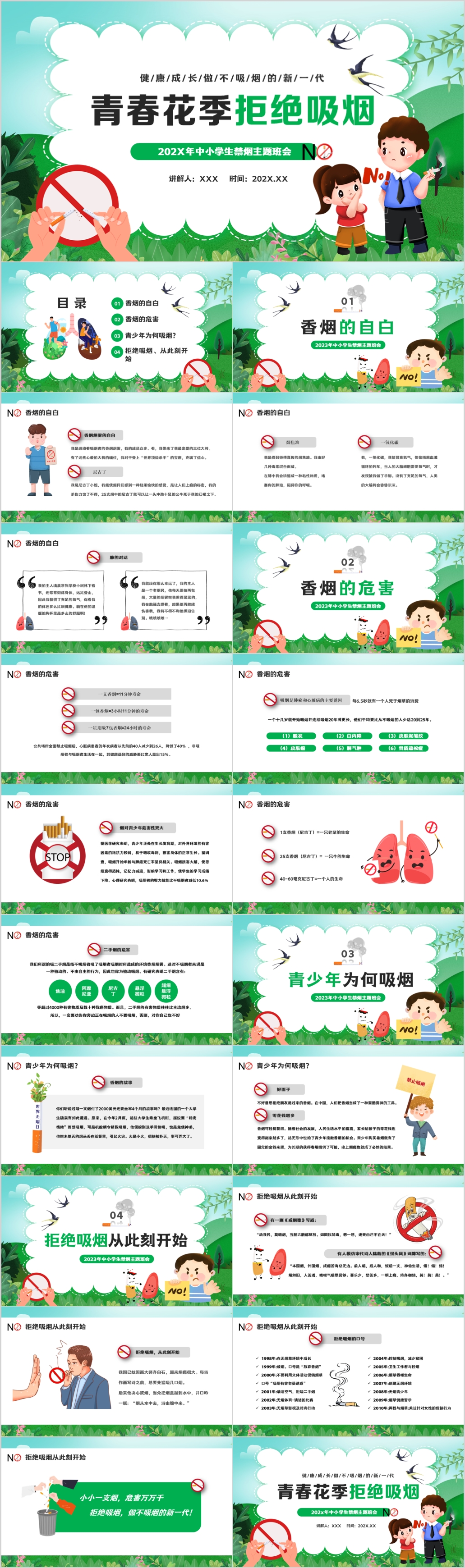 绿色2023年中小学生世界无烟日禁烟主题班会ppt模板