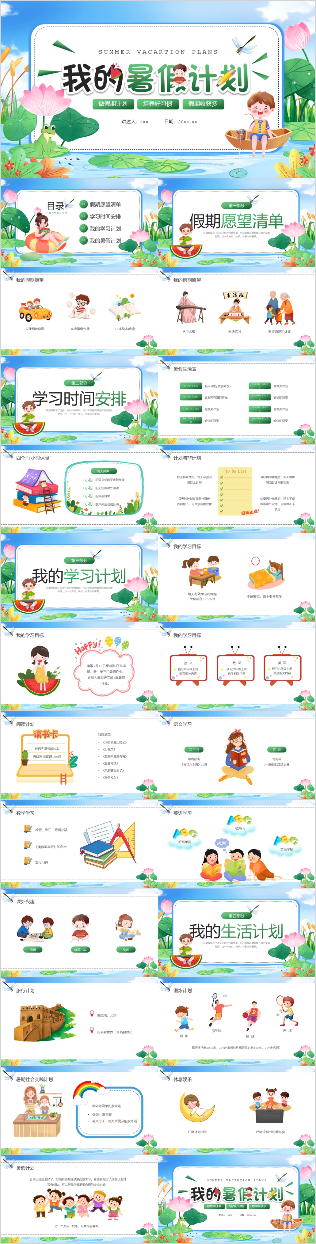 卡通幼儿园中小学生我的暑假计划暑假生活主题班会课件PPT模板