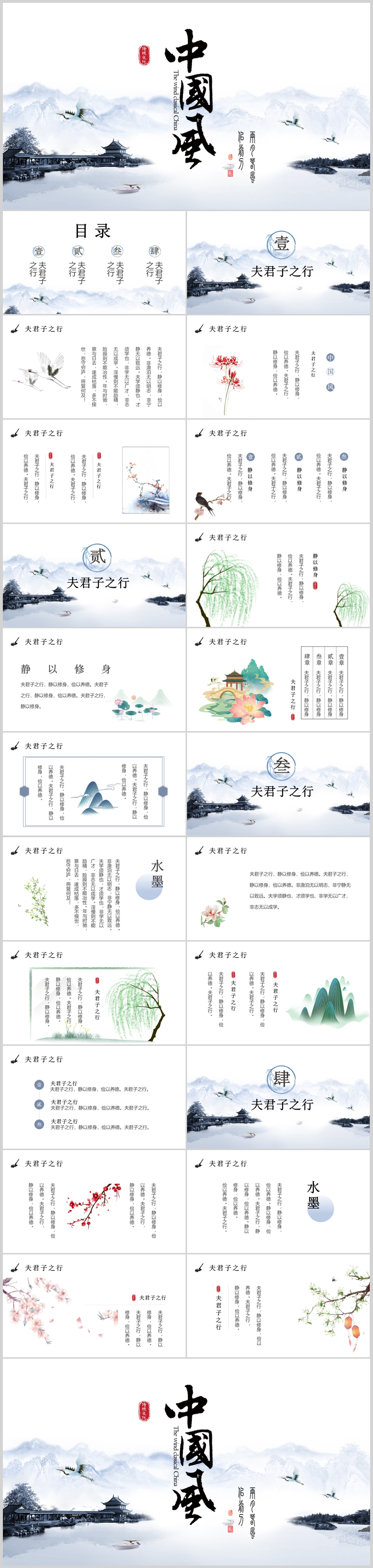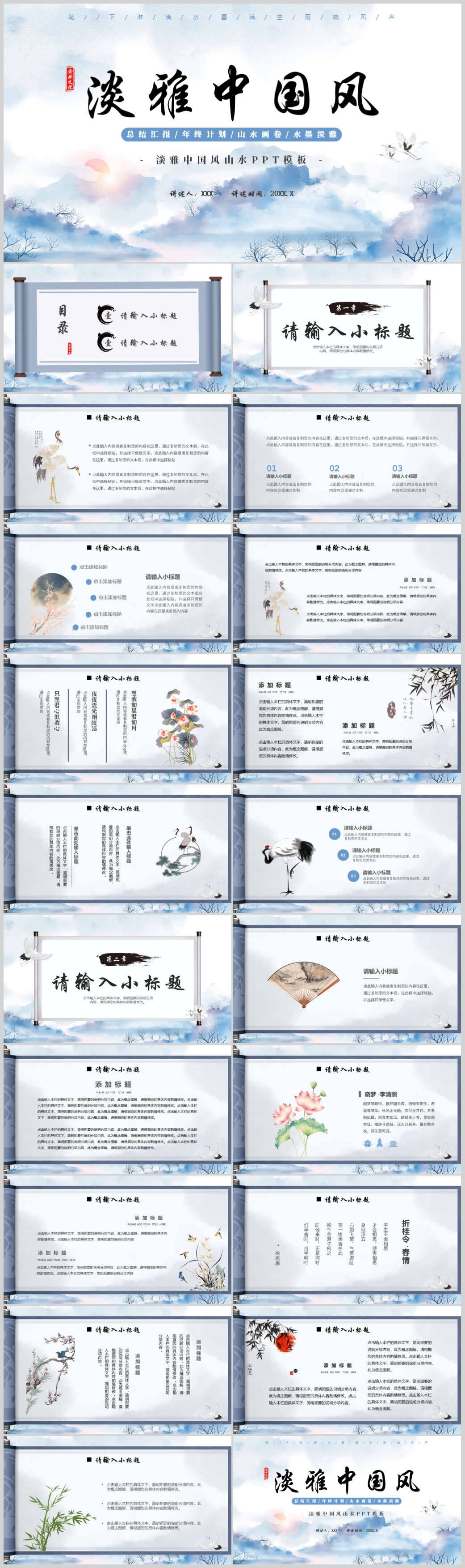 蓝色古风水墨山水中国风国学传统文化PPT模板