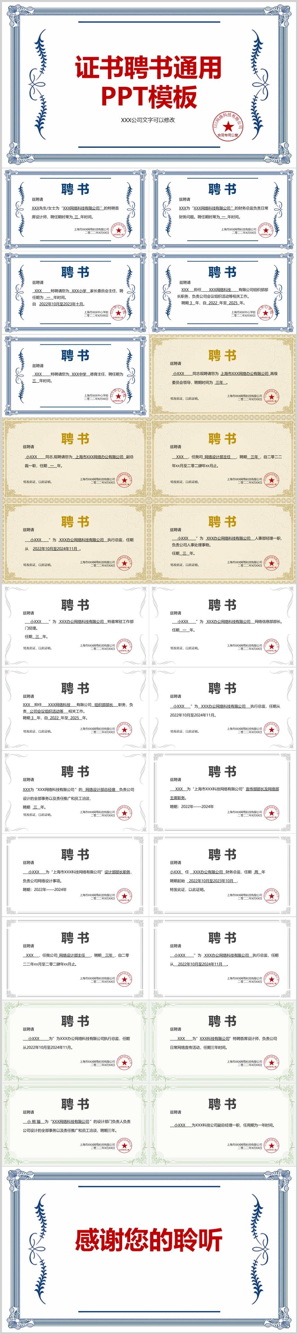 蓝色企业员工荣誉证书聘书通用PPT模板