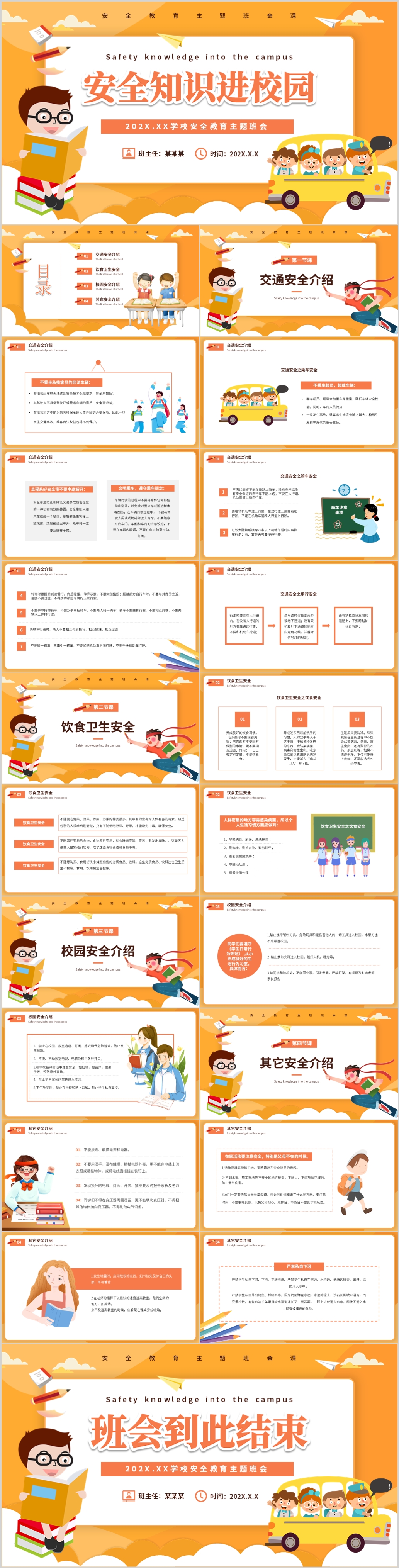 卡通校园安全知识讲座教育内容主题班会课件PPT模板