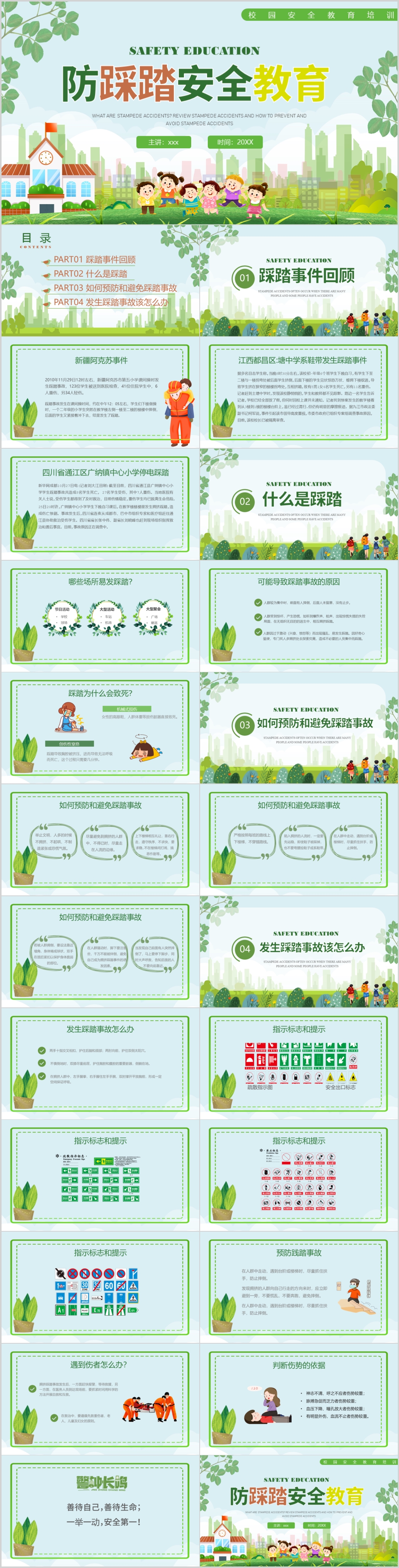 绿色卡通防踩踏安全教育主题班会ppt课件模板