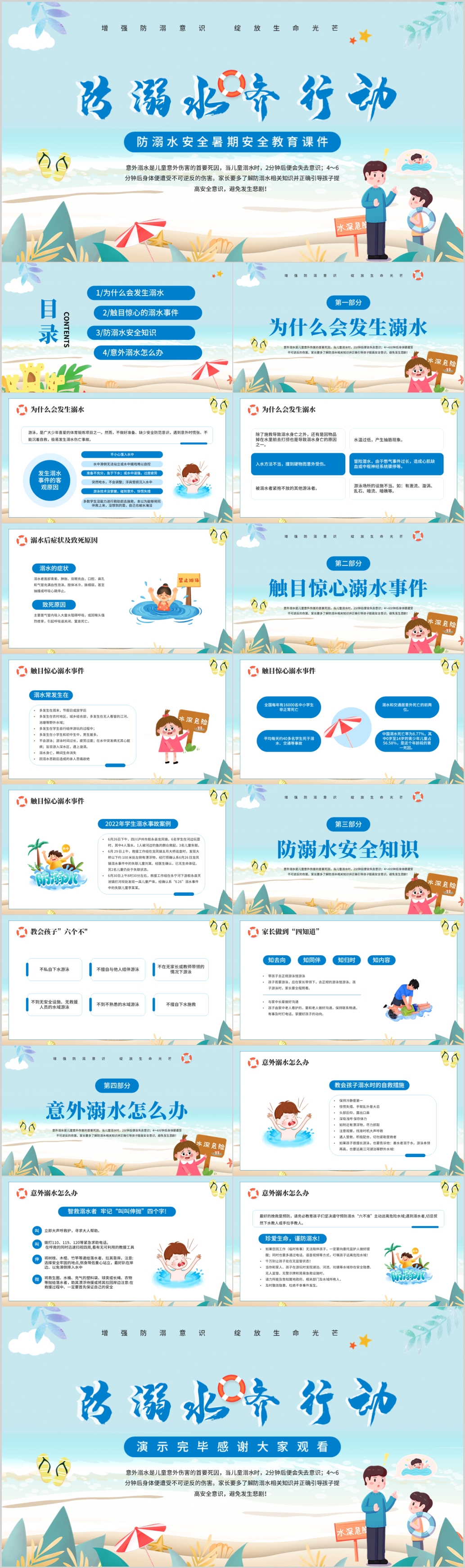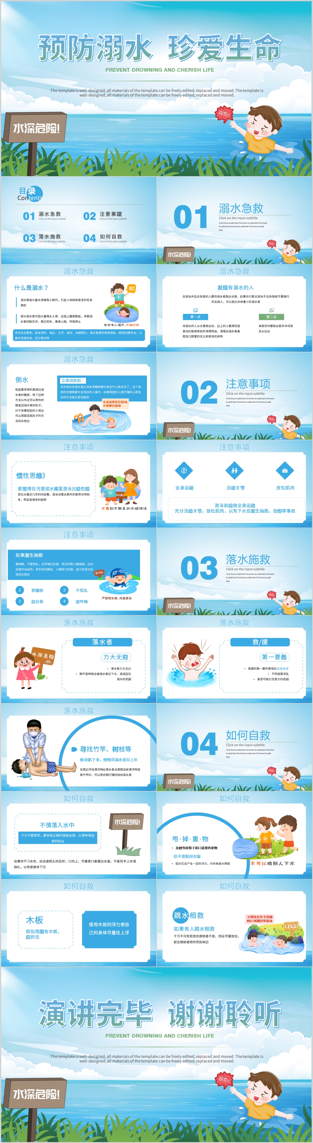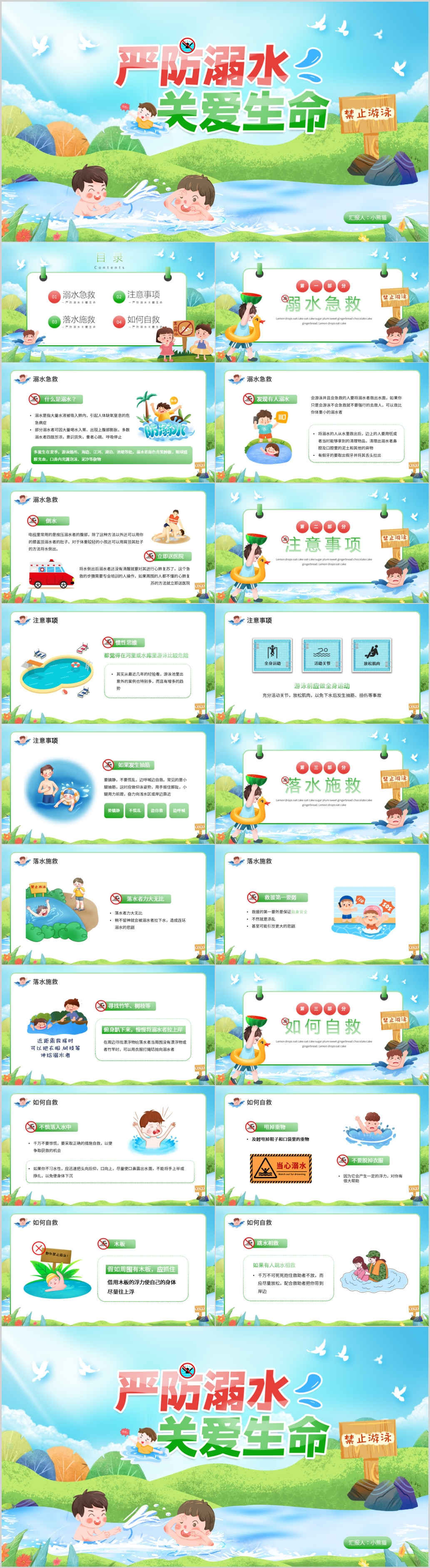 2023年蓝绿色可爱手绘风珍爱生命预防溺水主题班会PPT模板