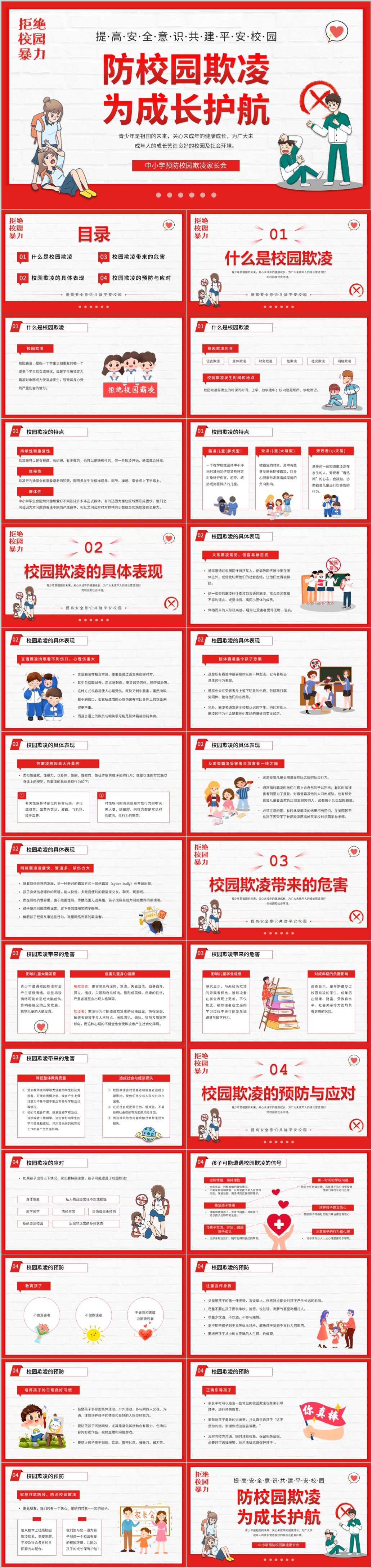 红色卡通简约风中小学生预防校园欺凌安全教育主题家长会PPT模板