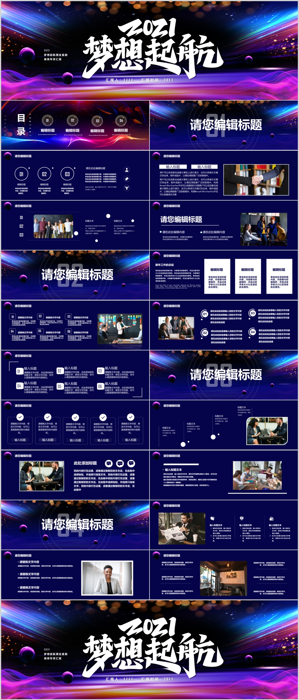 2021牛年蓝色科技感年终工作总结新年计划PPT模版梦想启航