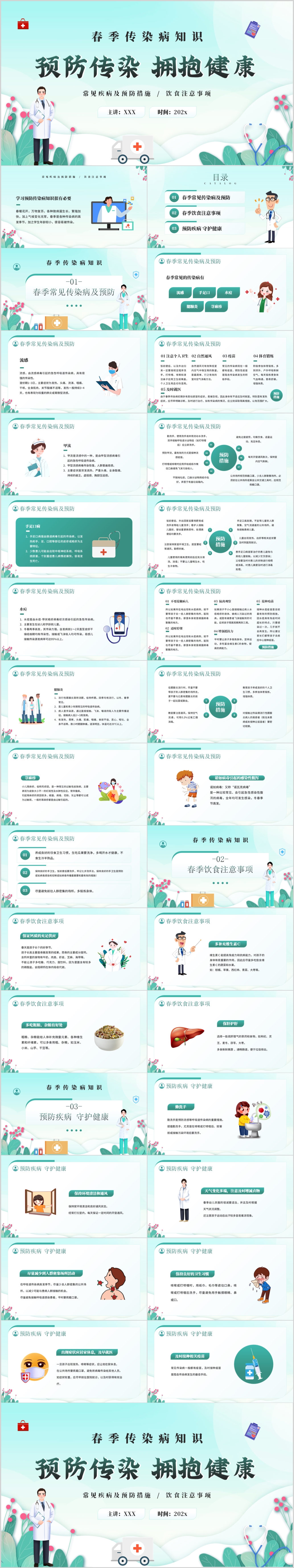 绿色卡通春季预防传染疾病关爱健康主题班会课件PPT模板