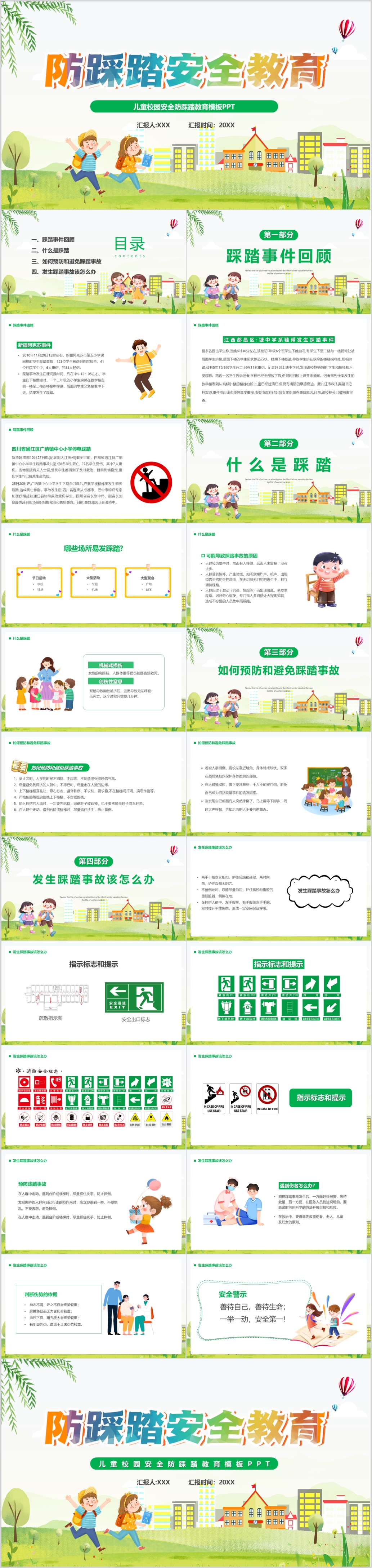 绿色卡通中小学生校园安全防踩踏教育主题班会课件PPT模板