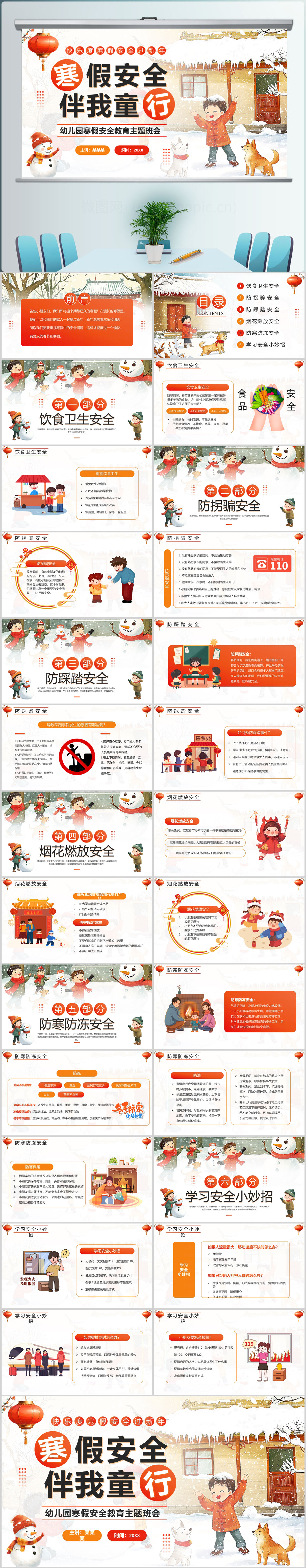 红色幼儿园寒假安全教育主题班会PPT模板设计