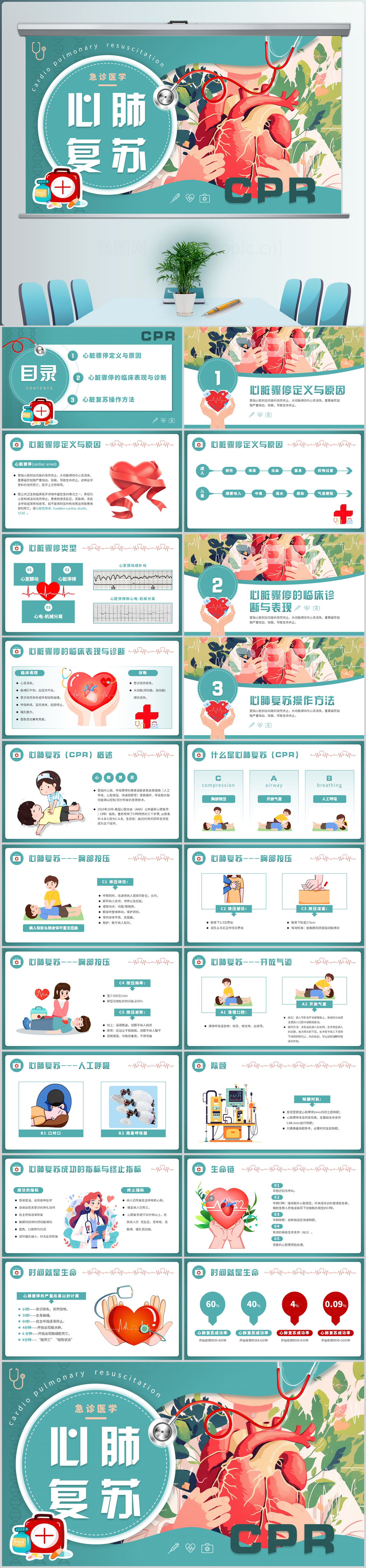 绿色插画风心肺复苏知识介绍PPT模板设计