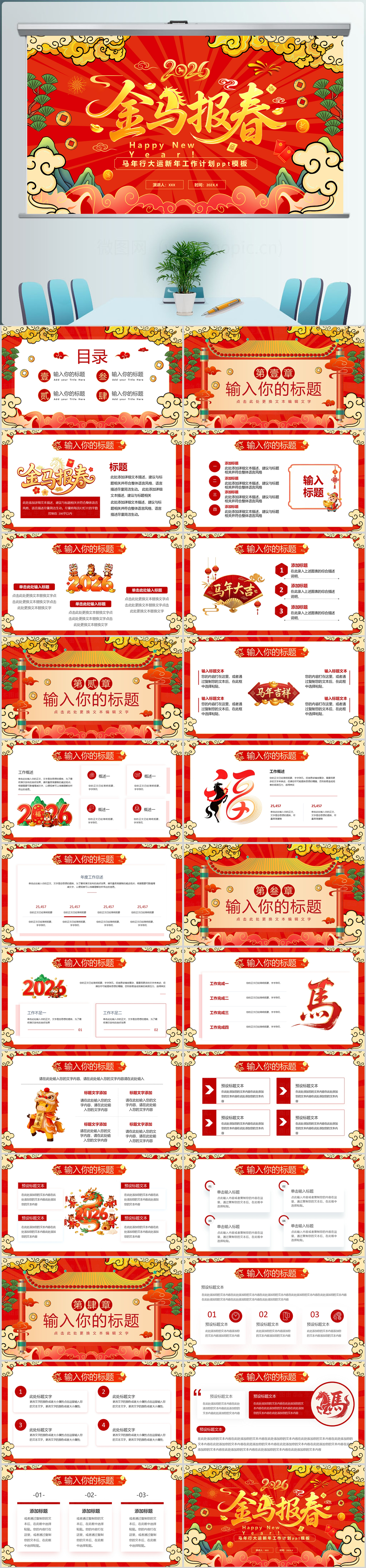 2026红色喜庆金马报喜马年新年工作计划通用ppt模板