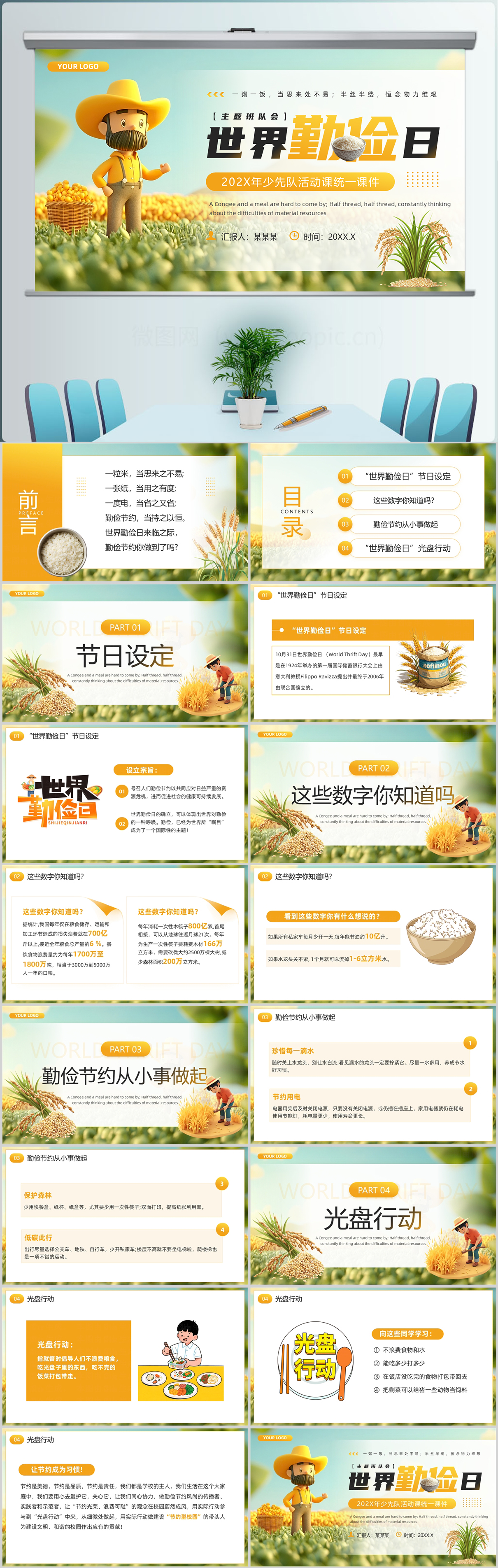 黄色插画风世界勤俭日主题班会课件PPT模板