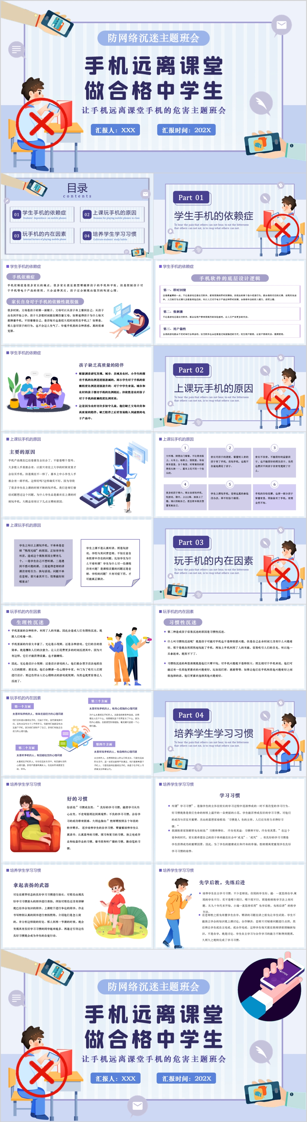 蓝色中小学生远离手机预防网络沉迷主题班会课件ppt模板