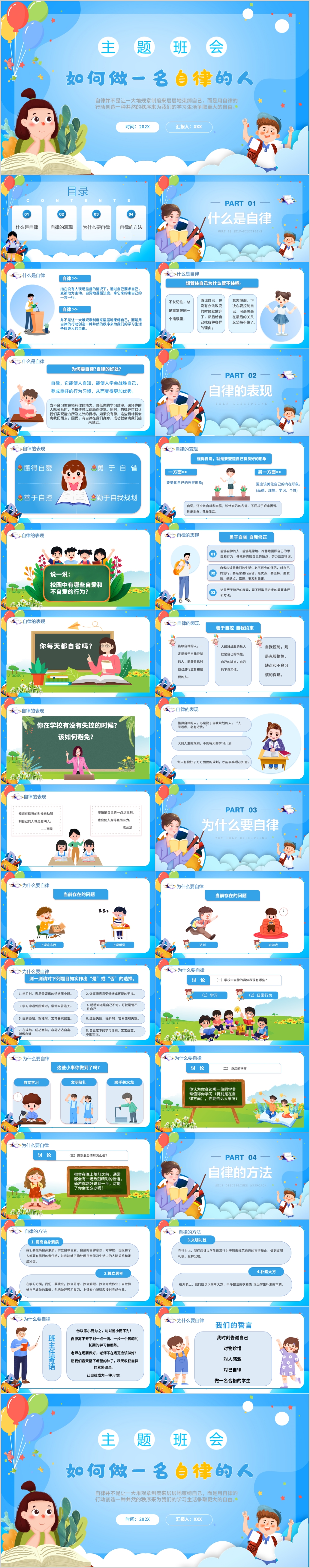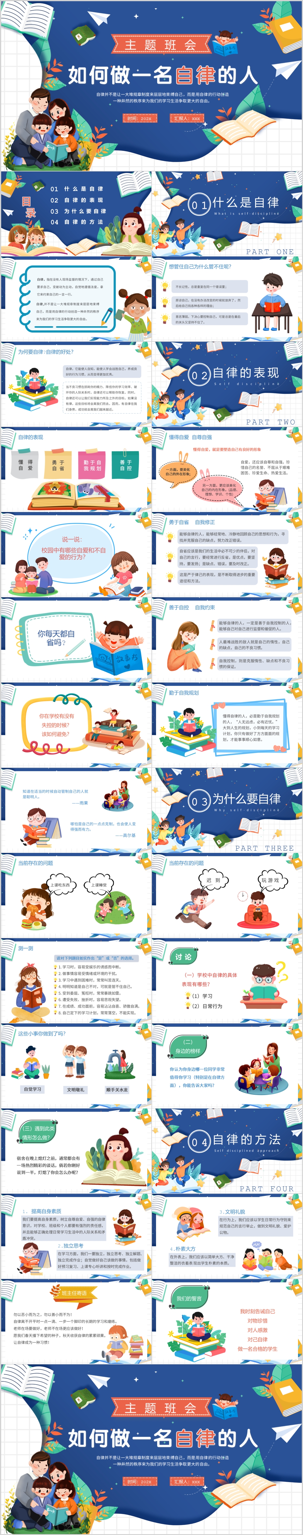 蓝色卡通可爱如何做一名自律的人主题班会课件PPT模板