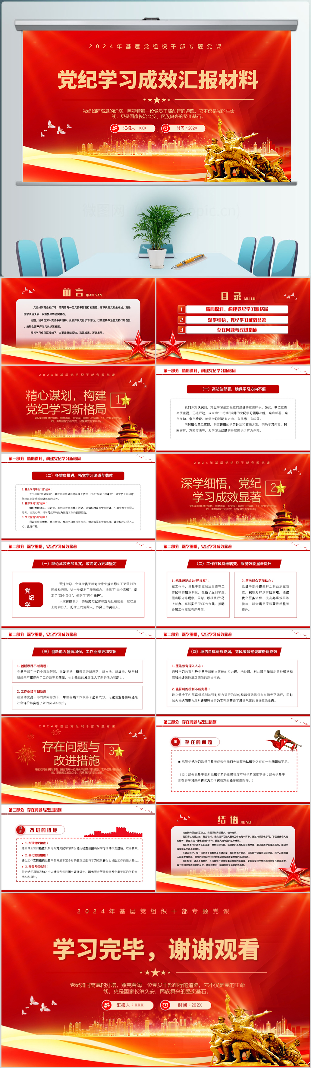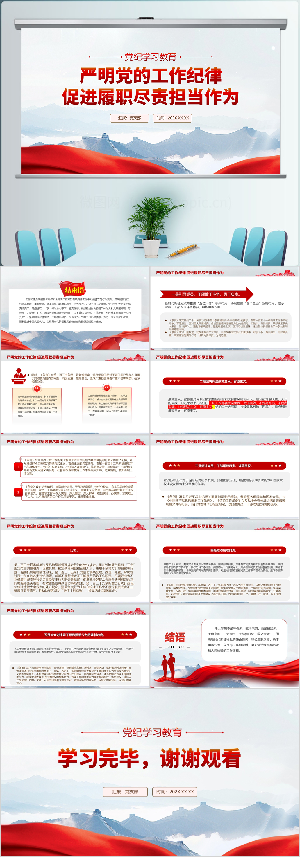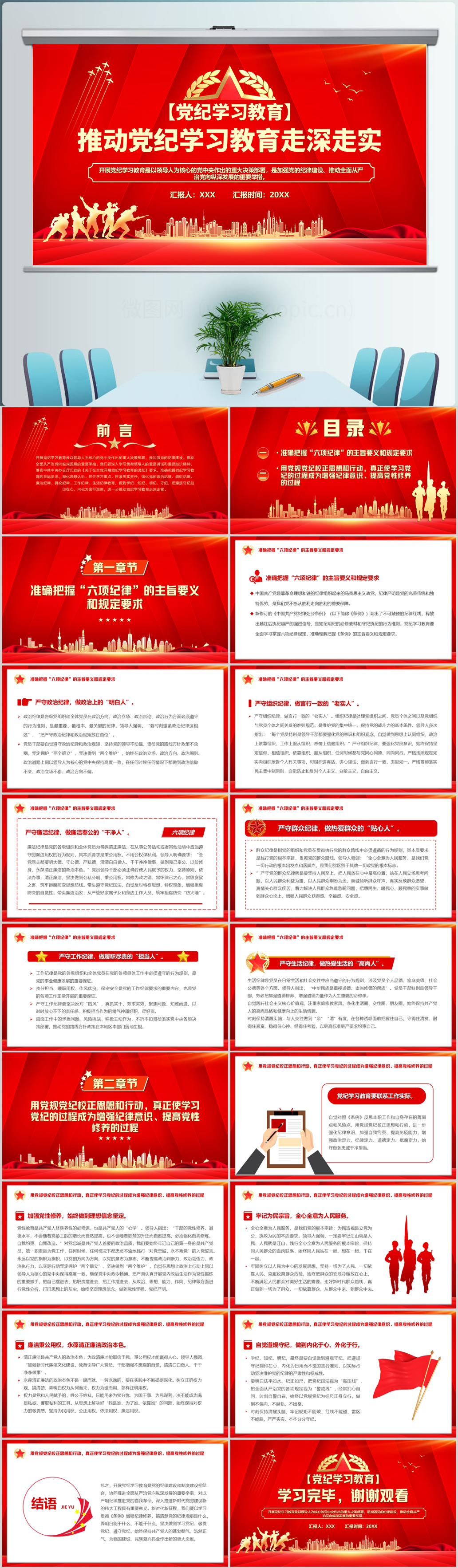 红色党纪学习成效汇报材料通用ppt模板(内含WORD演讲稿)
