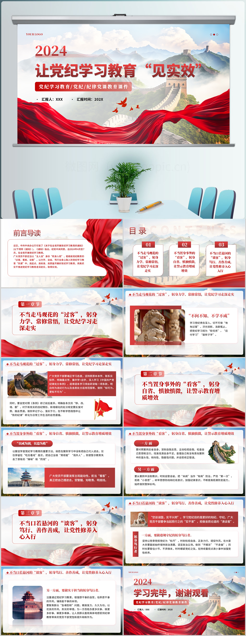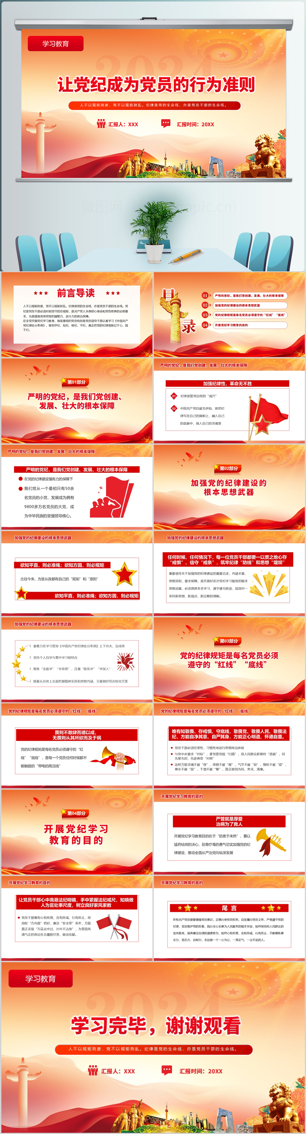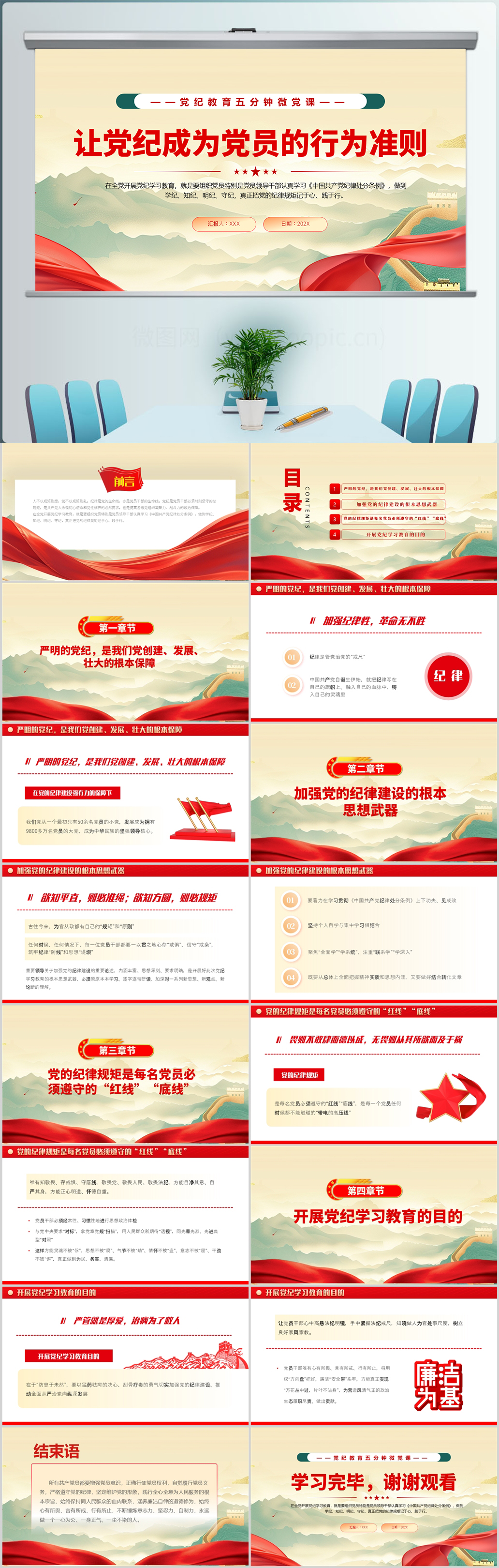 红色党纪学习成效汇报材料通用ppt模板(内含WORD演讲稿)