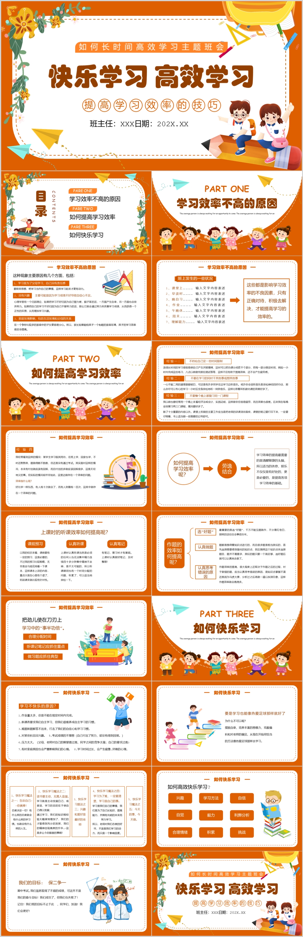 卡通中小学生如何长时间高效学习主题班会课件PPT模板