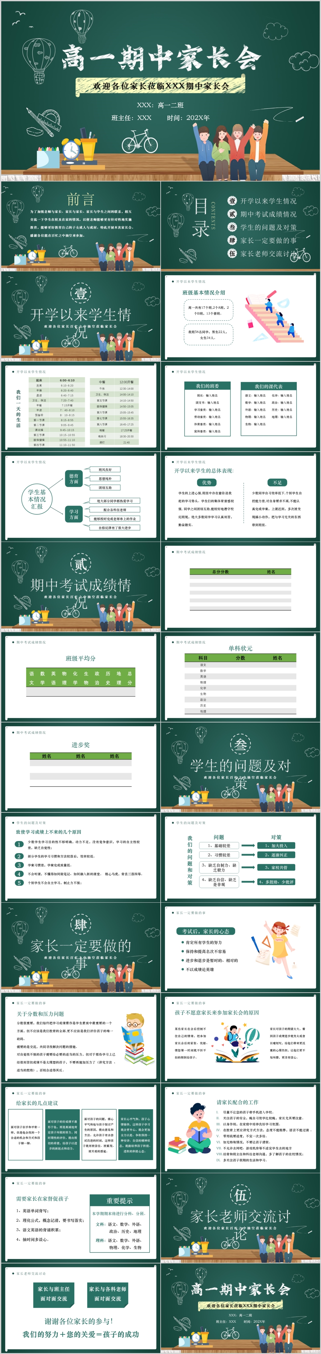 卡通黑板高一期中考试成绩总结家长会主题班会课件PPT模板