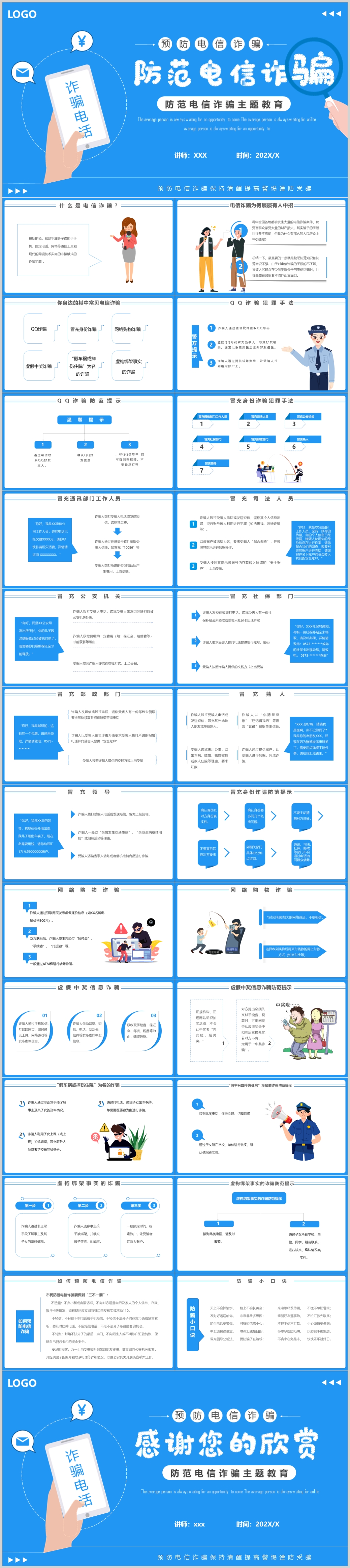 蓝色预防电信网络诈骗小知识培训主题班会ppt模板