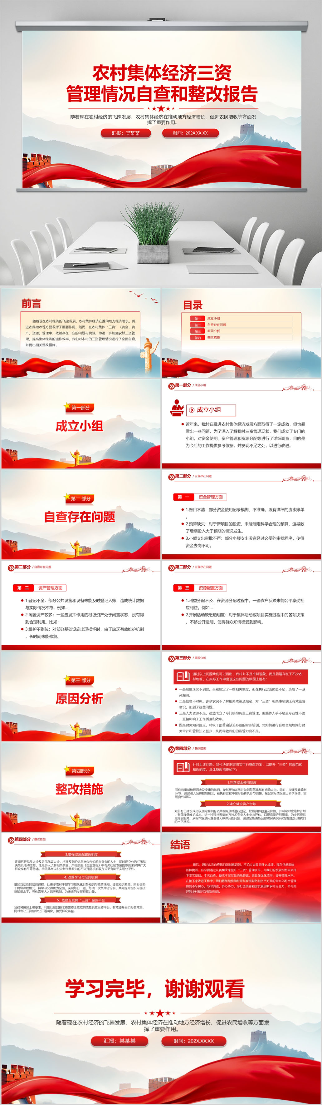 2024农村集体经济三资管理情况自查和整改报告PPT模板(内含WORD演讲稿)