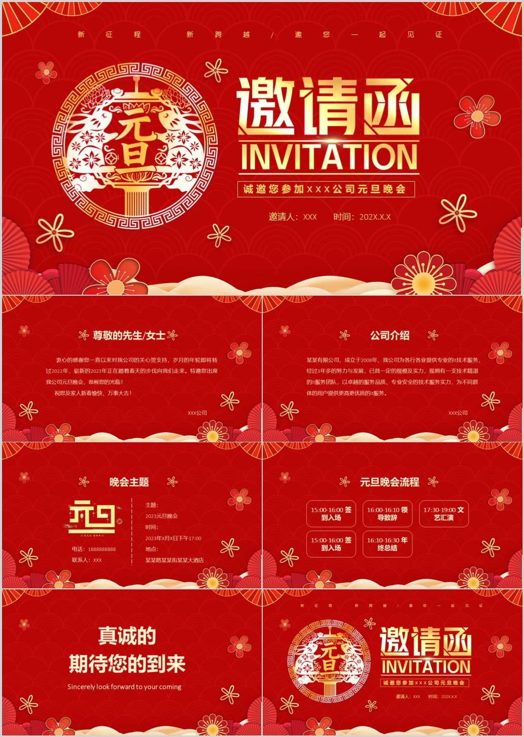 红色喜庆2023兔年元旦新年春节晚会邀请函电子贺卡PPT模板