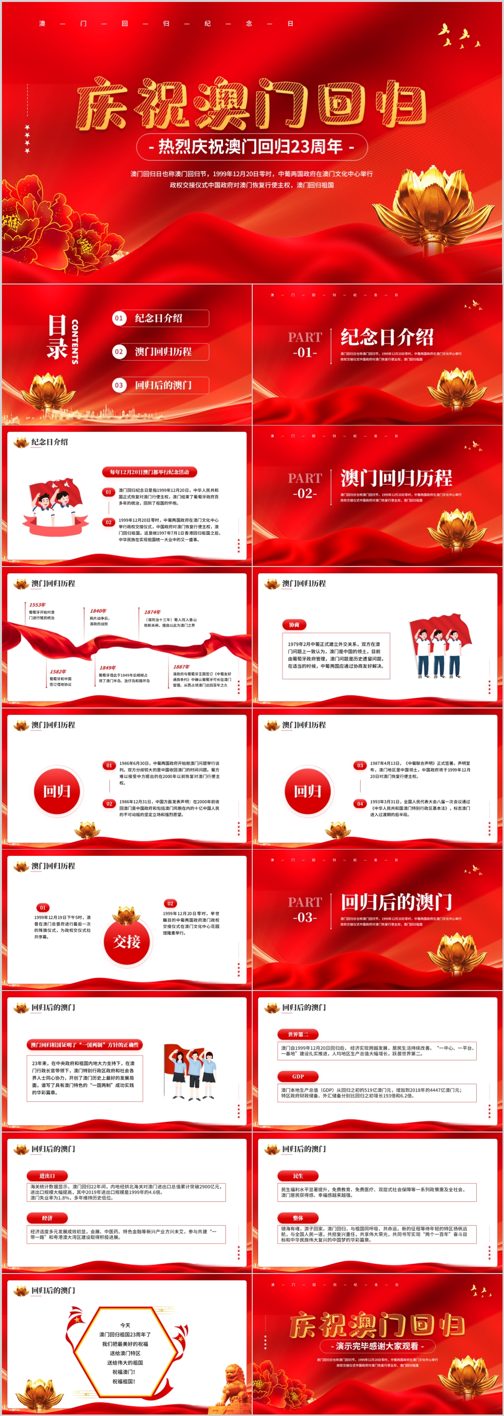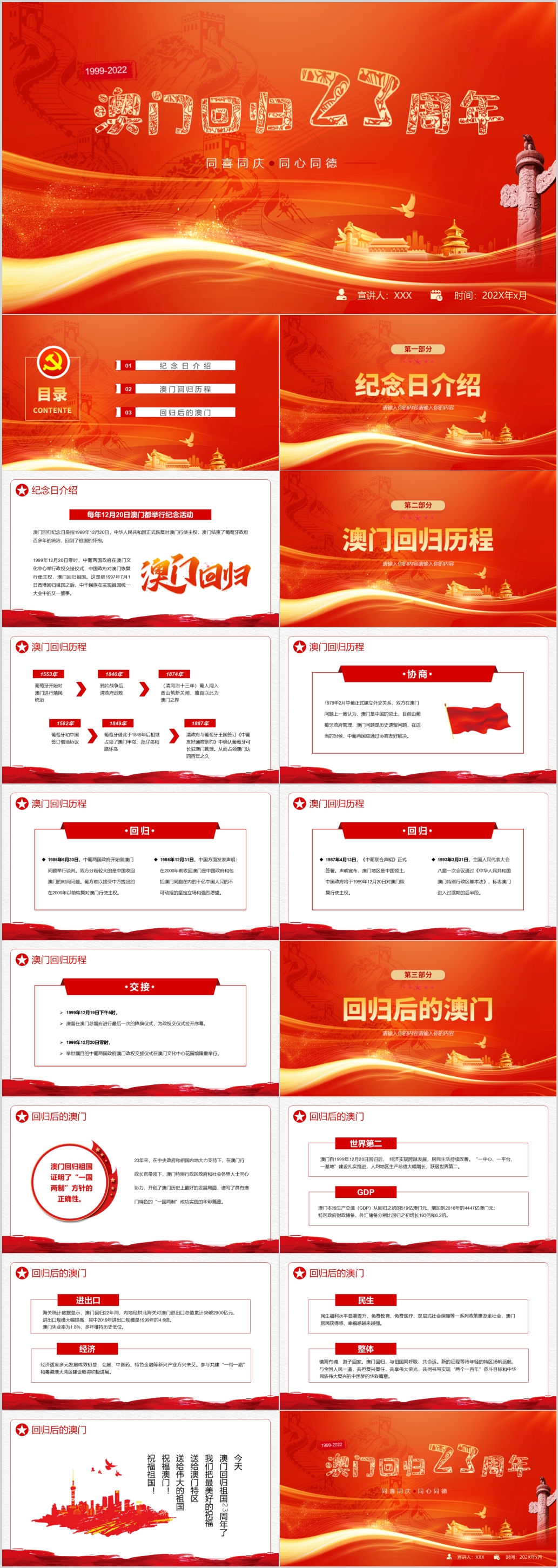 红色庆祝澳门回归23周年党政党建演讲培训PPT模板