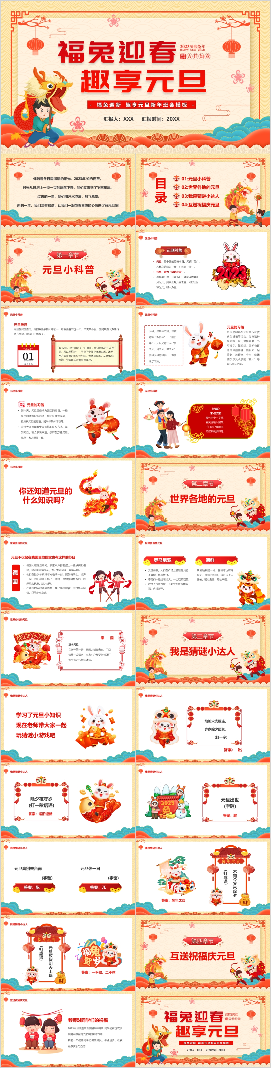 2023卡通中小学生福兔迎春趣享元旦新年联欢晚会班会PPT模板