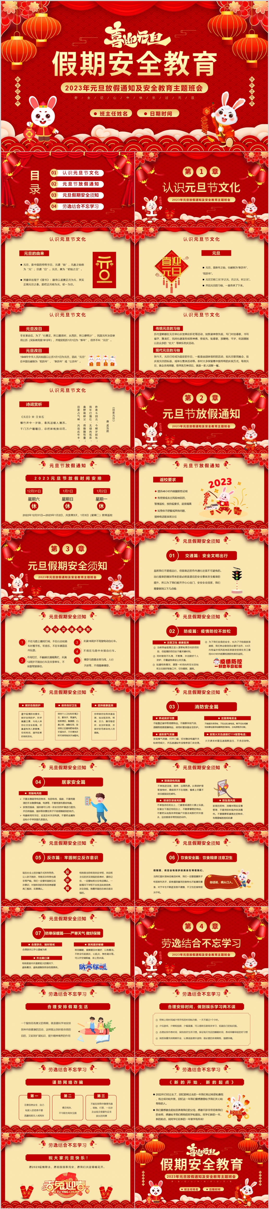 红色喜庆2023兔年元旦放假假期安全教育主题班会课件PPT模板