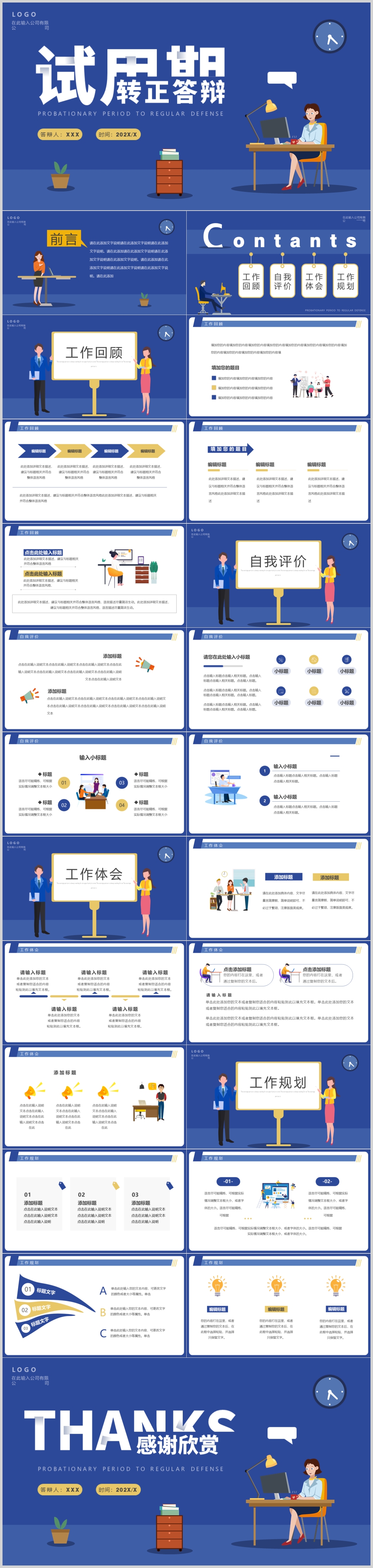 蓝色商务欧美风试用期转正述职答辩PPT模版