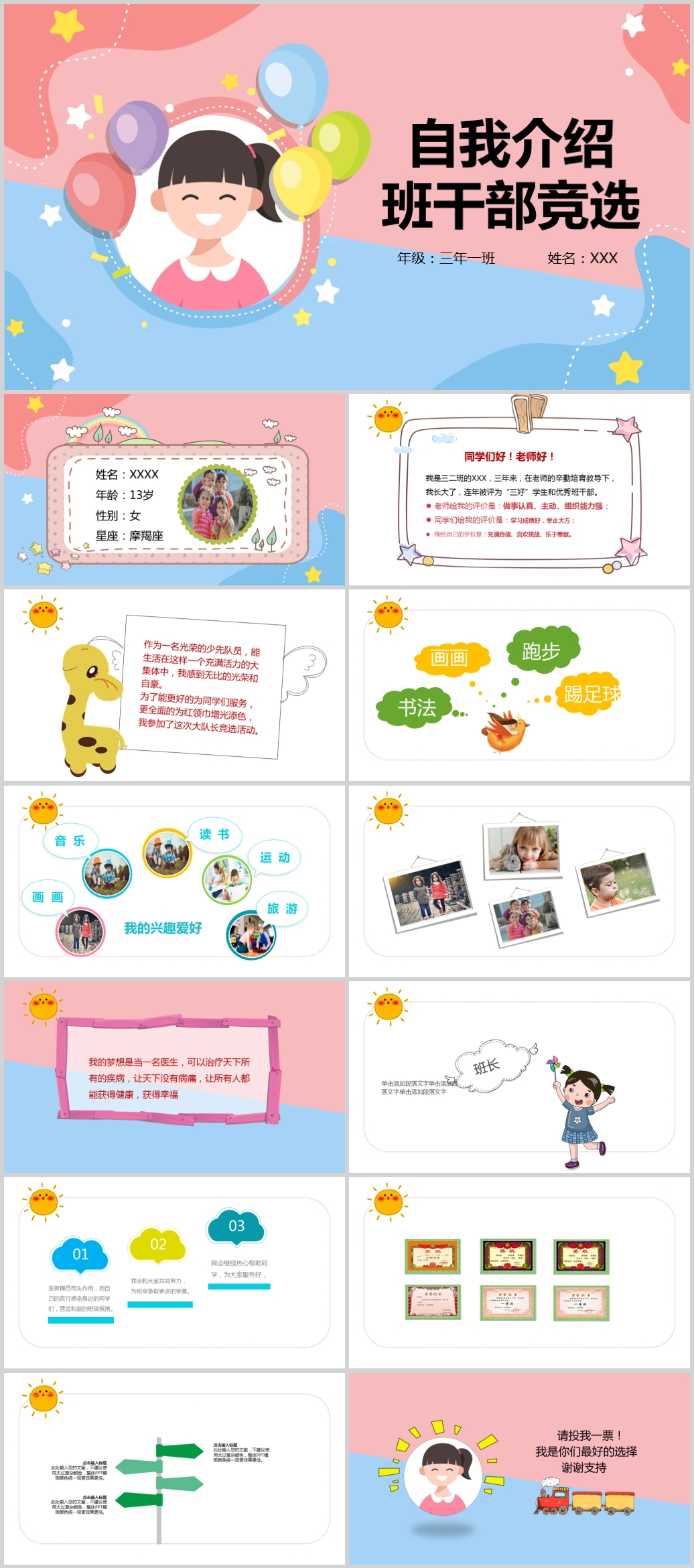 2022自我介绍卡通风中小学生班干部竞选主题班会PPT模板