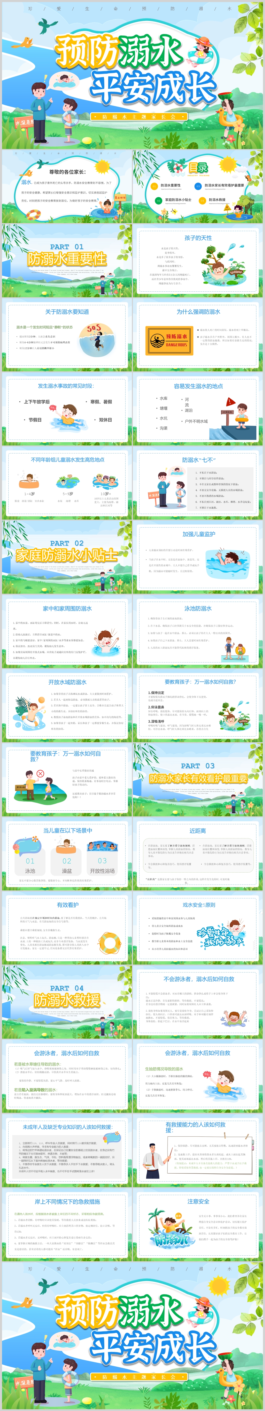 卡通幼儿园中小学生预防溺水平安成长主题班会PPT模板