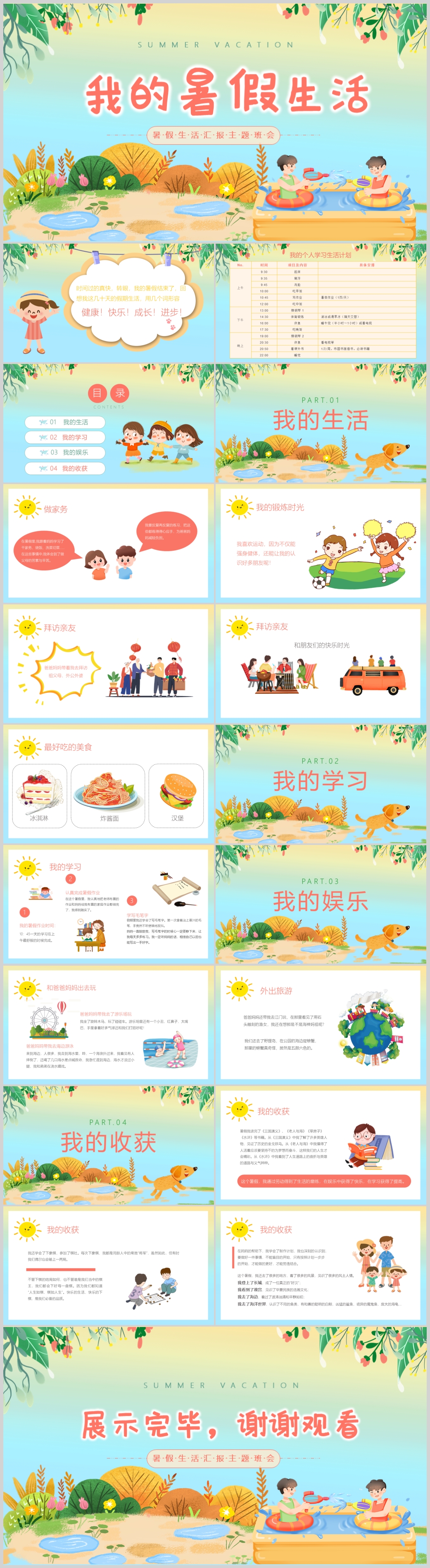 卡通幼儿园中小学生我的暑假生活记录汇报主题班会PPT模板