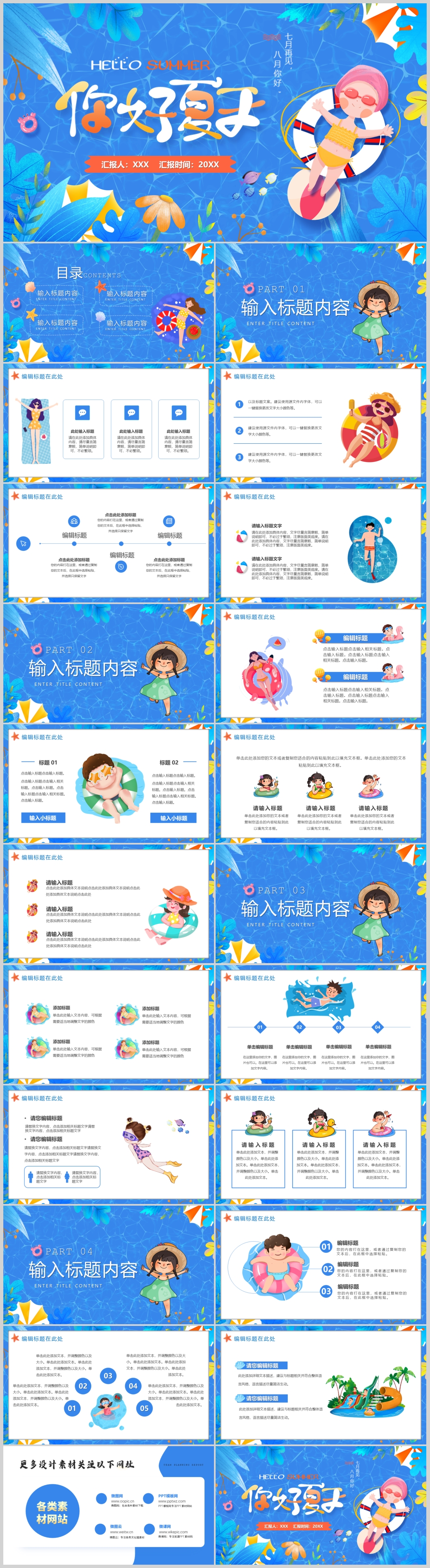 蓝色清新夏天夏季你好夏天工作总结年中总结PPT模板