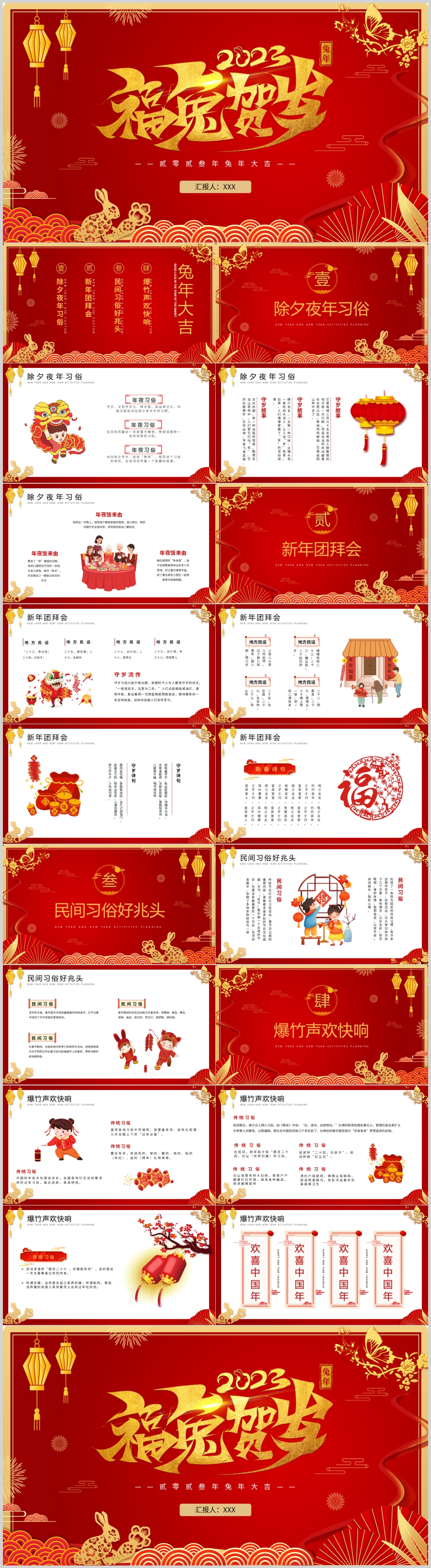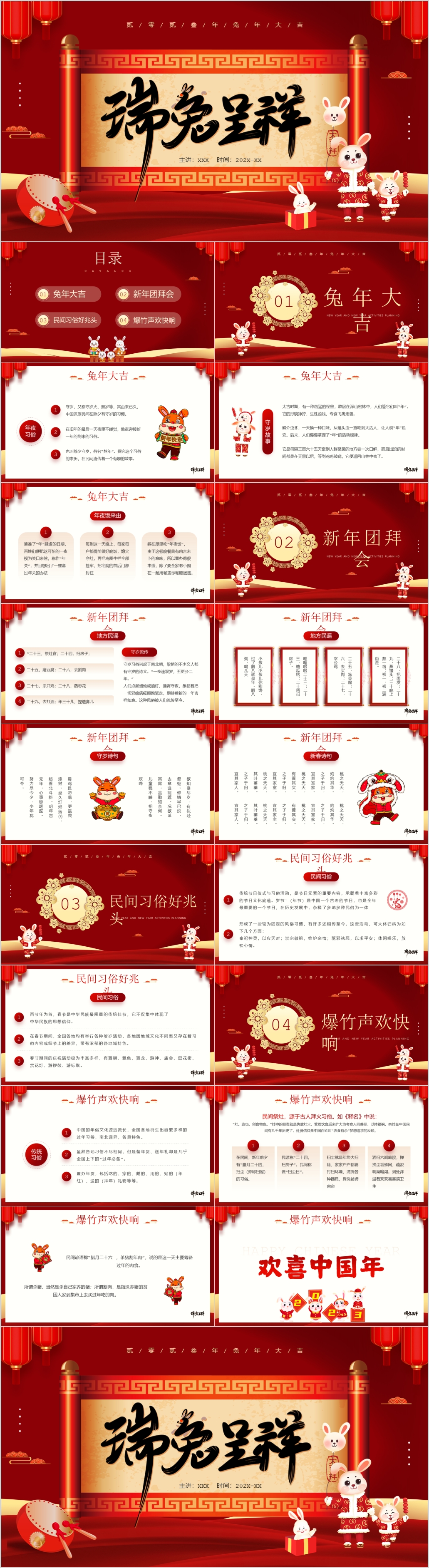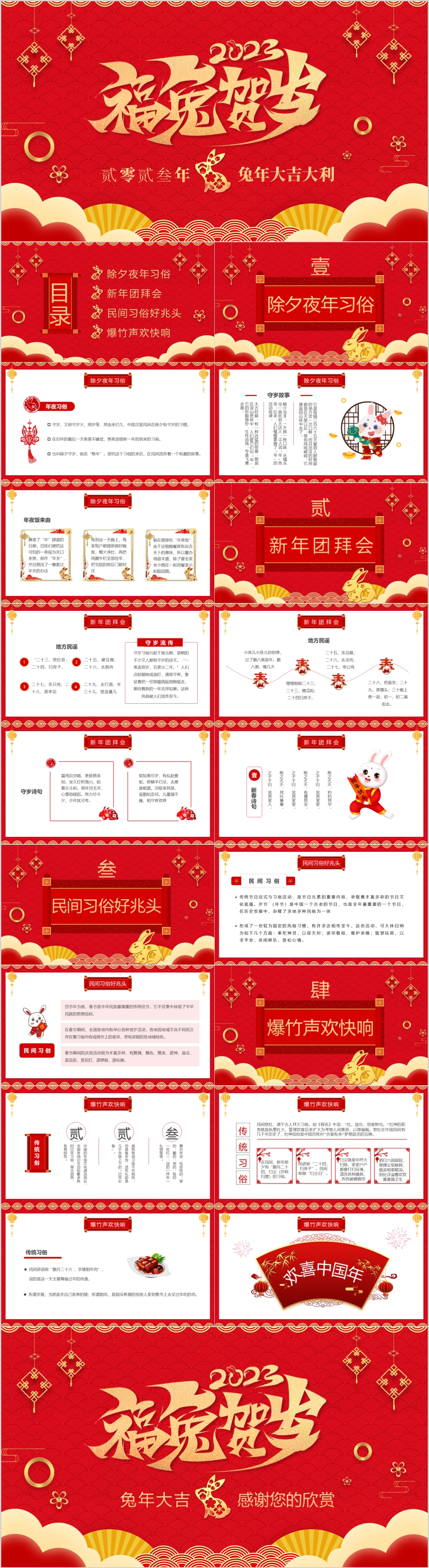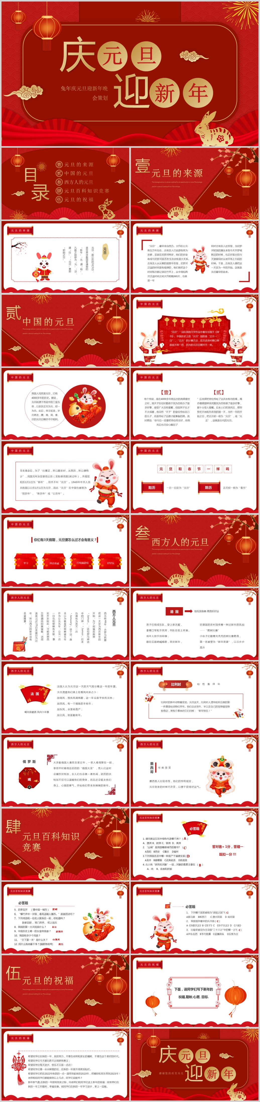 2023年喜庆福兔贺岁元旦新年春节节日介绍主题班会ppt模板